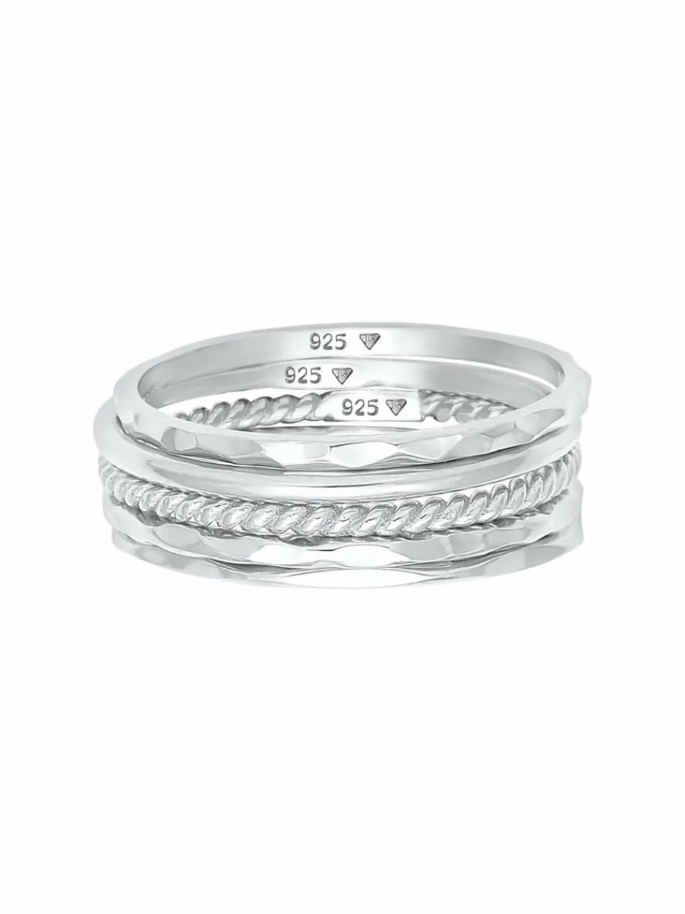 Dieses angesagte Ring Set, rundet jedes Outfit ab. Die filigrane Optik und das einzigartige Design dieser Stapelringen aus 925 Sterling Silber, ist das perfekte Accessoire für jeden Anlass. Das Set besteht aus drei strukturierten, einen gedrehten und ein glatter Fingerring, die je nach Lust und Laune zum Kombinieren einladen. Tragen Sie die Schmuckstücke aufgestapelt an einem Finger oder verteilt auf allen Fingern für einen schicken Stacking-Look.