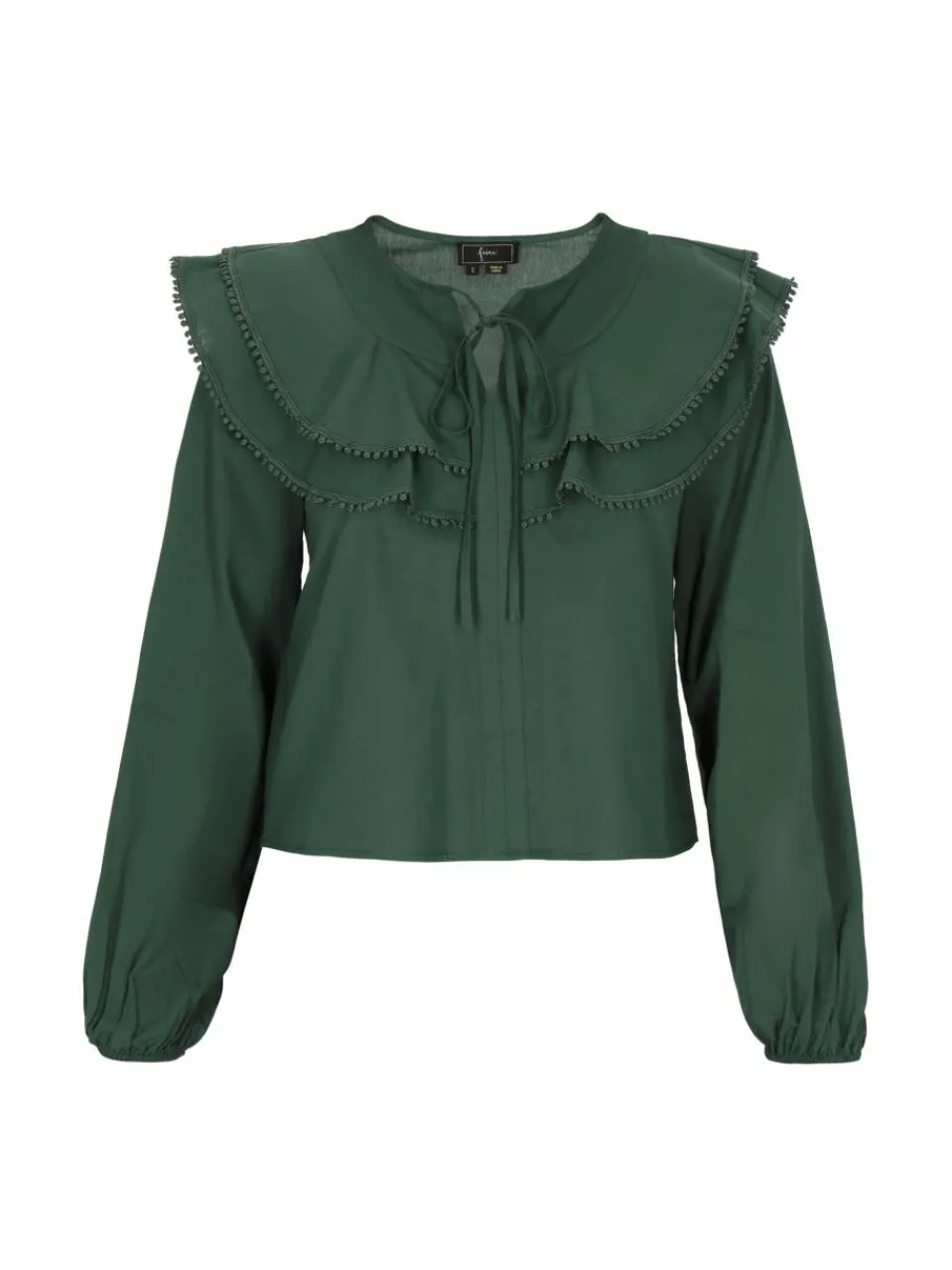 Verwöhnen Sie sich mit femininem Charme in dieser exquisiten Bluse. Der runde Ausschnitt besticht durch ein zartes Rüschendetail, das über die Schultern fällt und einen subtilen Volant-Effekt erzeugt. Ein dekoratives Band an der Vorderseite sorgt für zusätzliche Anziehungskraft. Die geraffte Passe vorne verleiht der Bluse mehr Volumen, während die Ärmel elegant am Handgelenk gerafft sind und eine gepuffte Manschette bilden.
