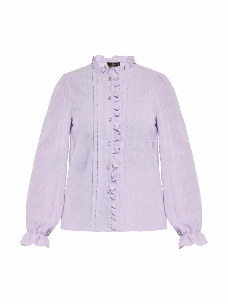 Elevate your wardrobe with this dobby shirt with frills. The romantic long-sleeve shirt features a textured pattern throughout, buttton-down closure and a ruffled stand-up collar. The vertical ruffle details on the front add a feminine touch. Finished with elasticized ruffled cuffs, this semi-formal shirt is perfect for business casual or dressy occasions. This product is a part of Romantic Collection