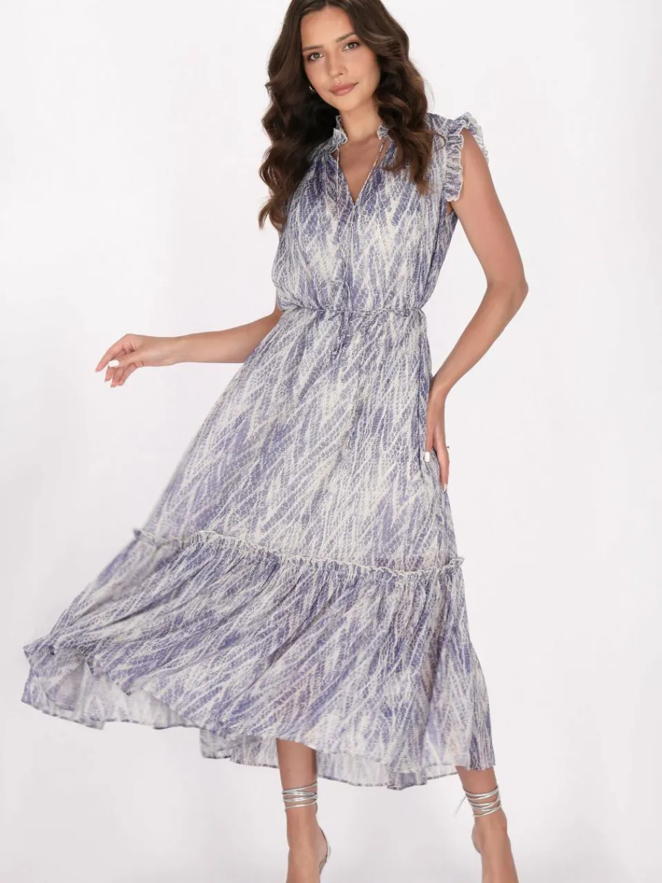 Unleash your wild side with this captivating snake print midi dress. The cinched waist and tie belt create a flattering silhouette, while the high neckline and short sleeves add a touch of femininity. The gathered skirt flows into a flared shape with a ruffled hemline for an effortlessly chic look. Made from lightweight, semi-sheer fabric, this dress is perfect for warm weather or layered styles. Embrace the trend with this stylish piece featuring chiffon fabric and delicate frills. This product is a part of Snake Print Collection