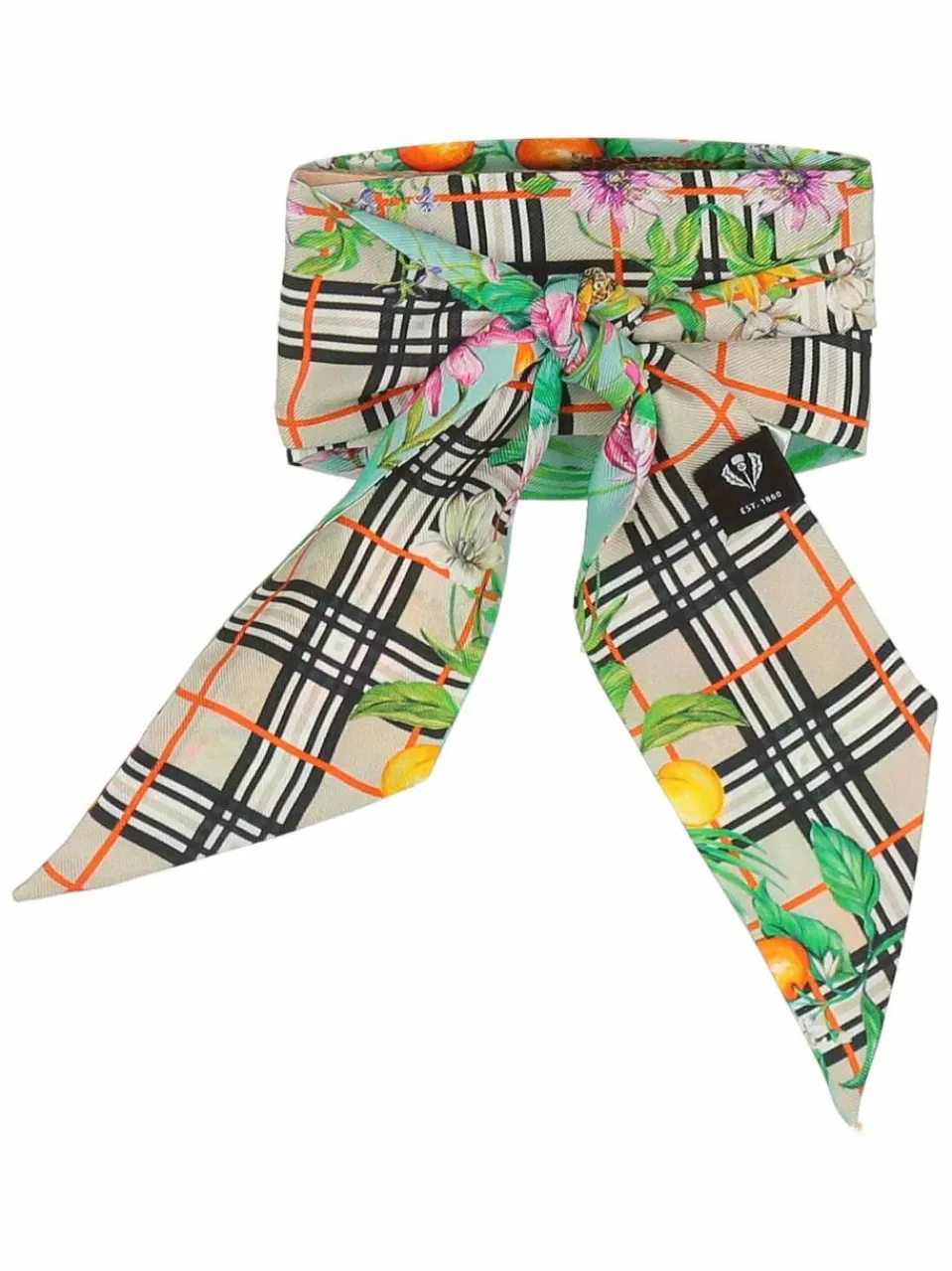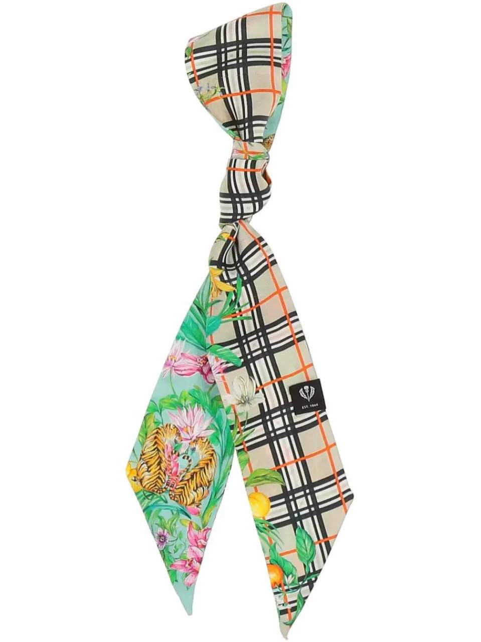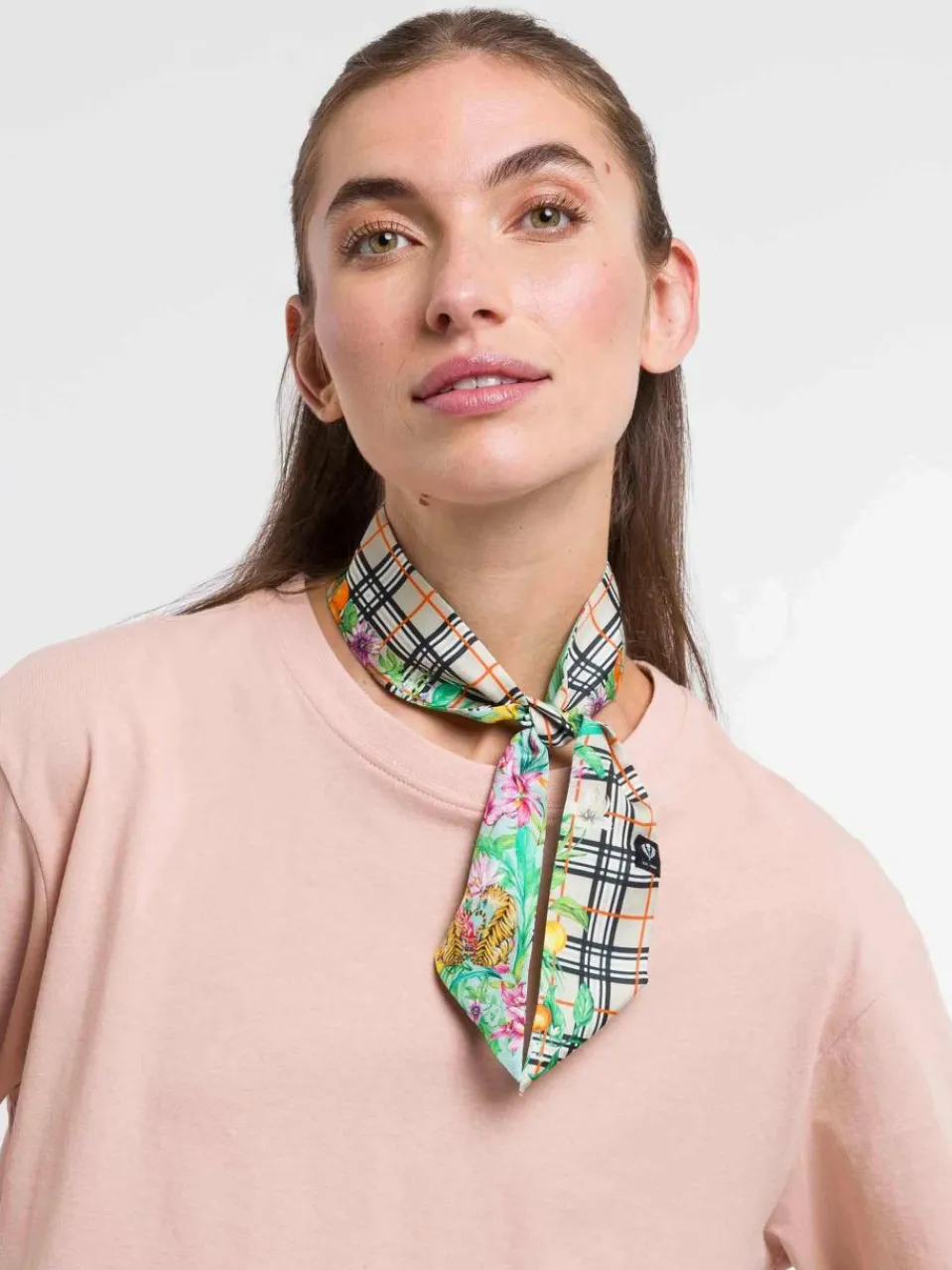 Raffinierter Hingucker: Der schmale Seidenschal von FRAAS misst 5 x 80 cm. Eine Seite zeigt das klassische FRAAS Karo, umspielt von tropischem Blumen-Print. Die andere Seite hat Dschungel-Print mit Tigern und Leoparden. Dank seines besonderen Formats lässt sich der Skinny-Schal als Choker um den Hals binden, aber auch super als Armband, Haarband, Gürtel oder Accessoire an der Handtasche tragen.