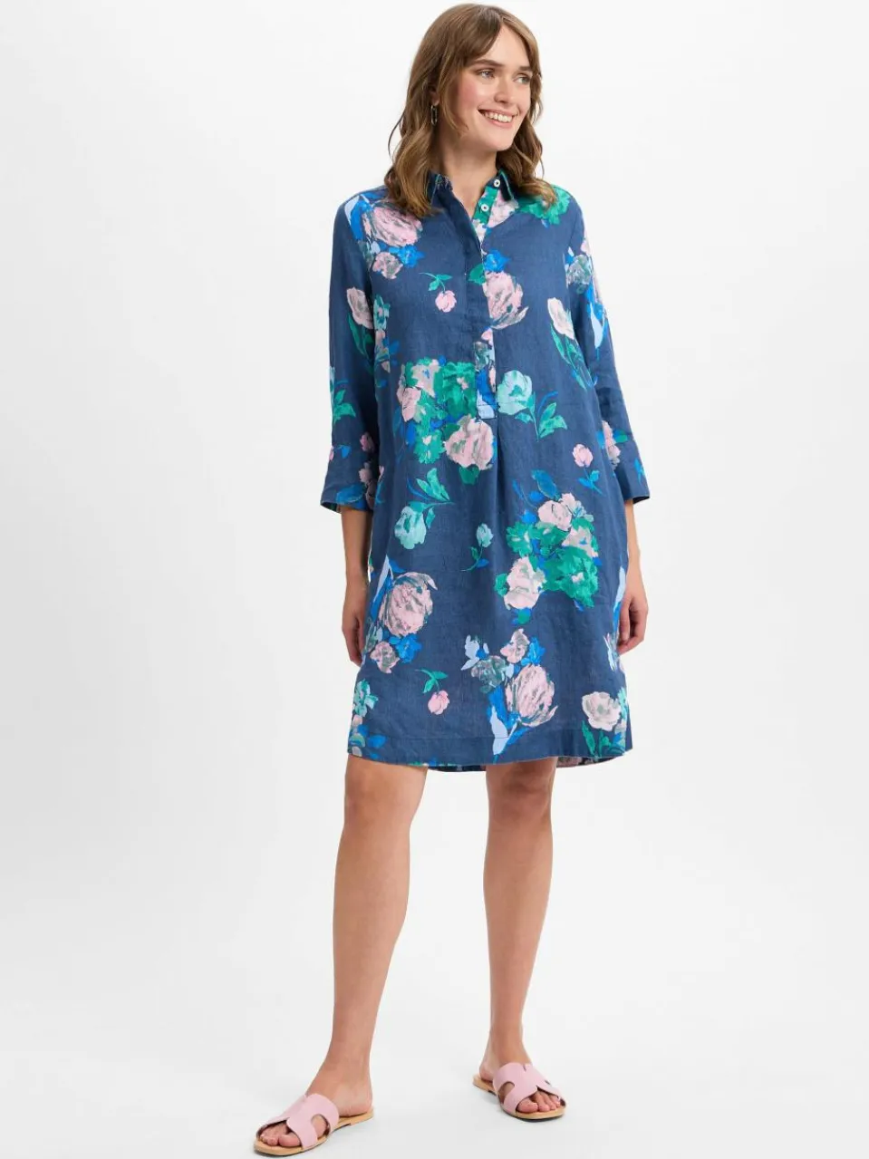 Bequemer Chic: Die luftige Leinen-Qualität und der nonchalante Hemdblusen-Stil des Apriori Kleids bereichern das Styling an warmen Tagen.