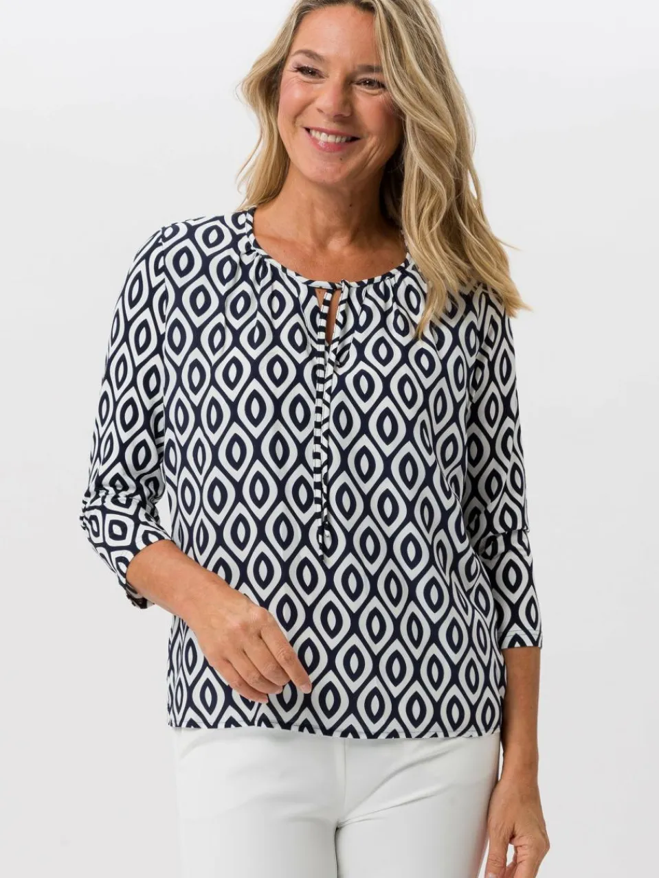 Dieses stilvolle Blusenshirt überzeugt mit einem modernen Muster und einer bequemen Passform. Der lockere Schnitt und der geschmeidige Stoff sorgen für hohen Tragekomfort. Ideal für elegante und legere Looks kombinierbar.