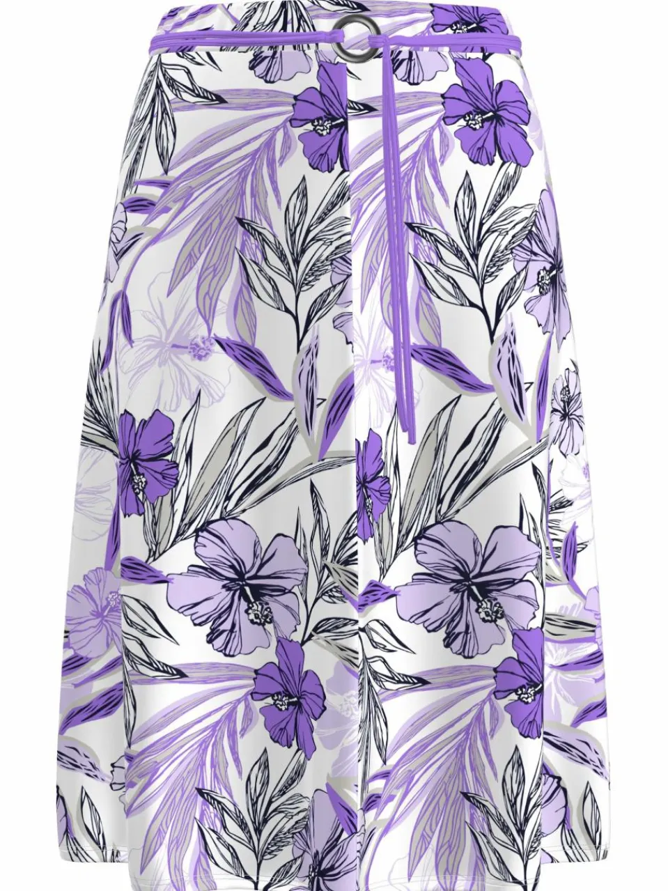 Druckrock in kniebedeckender Länge mit dekorativem und abnehmbaren Bindegürtel. Für guten Tragecomfort sorgt ein elastischer Taillenbund. Der Rock schwingt beim Gehen leicht mit und ist gefüttert.