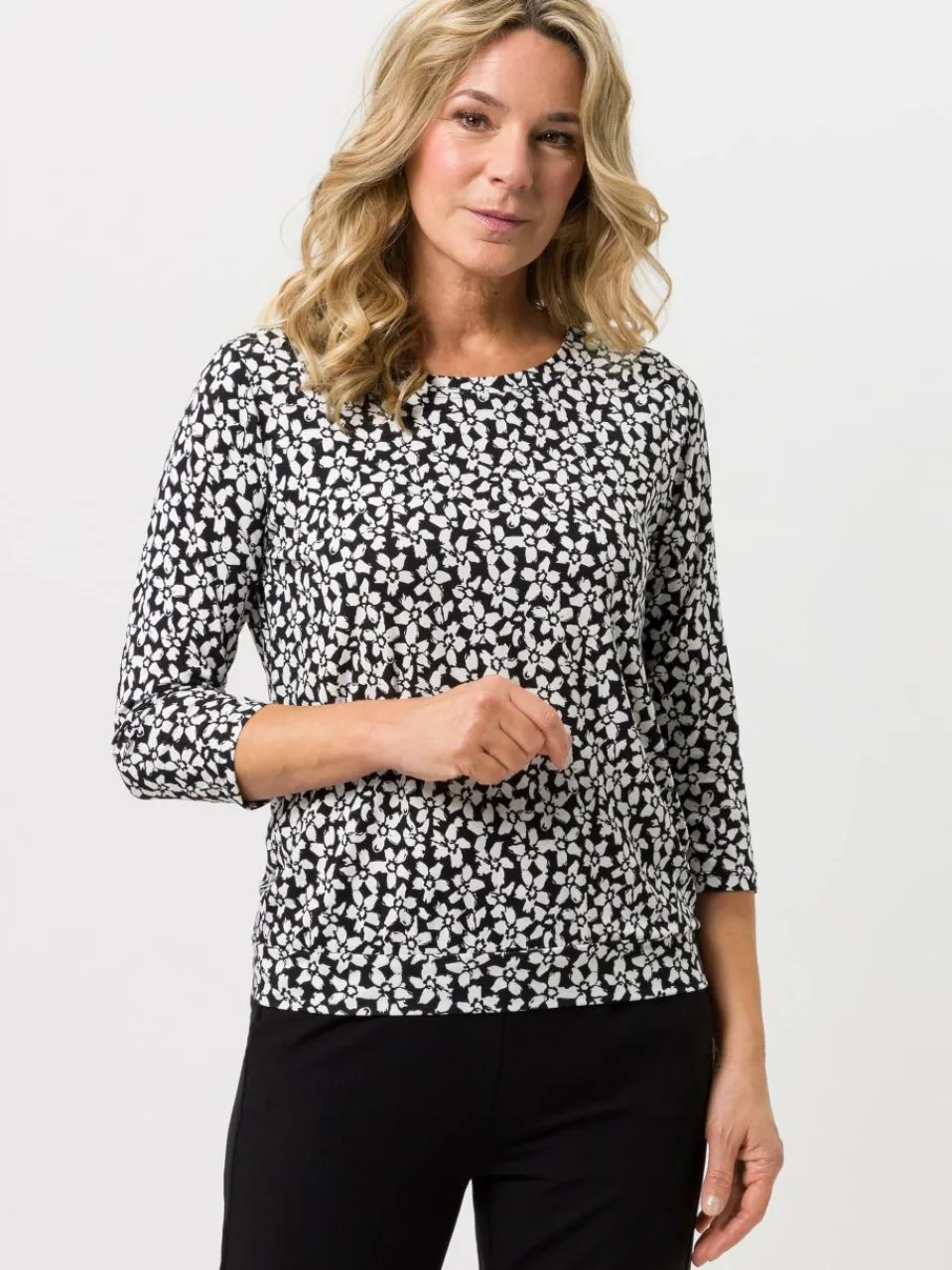 Unser Trauer-Shirt aus hochwertiger Viskose mit schwarz-weißem Muster vereint Komfort und Eleganz. Die 3/4-Ärmel verleihen dem Shirt eine stilvolle Note. Perfekt für würdevolle Anlässe. Kombinieren Sie es mit einer schwarzen Hose oder einem Rock.