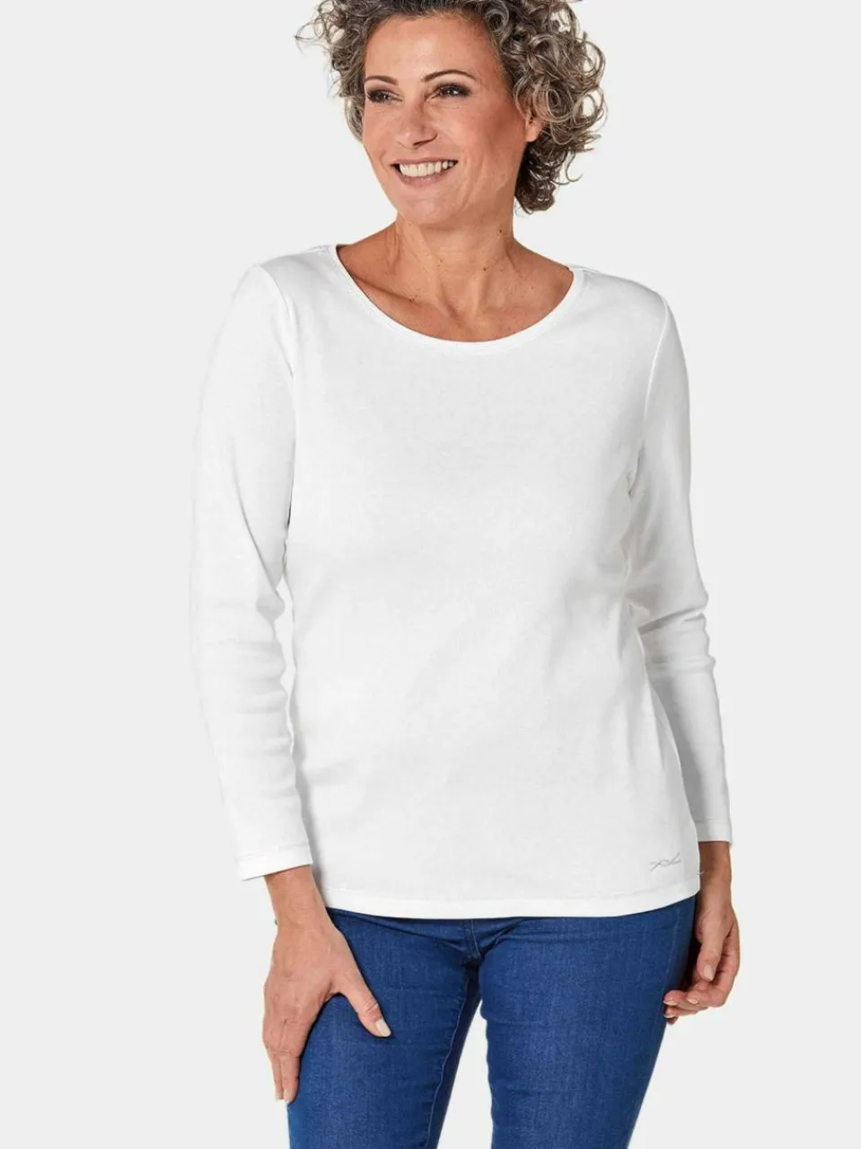Shirt, das sich durch die kreative Rippenstruktur herrlich weich und angenehm trägt. In modischem Stil mit U-Boot-Ausschnitt und langen Ärmeln gestaltet, begleitet Sie der lässige Allrounder durchs ganze Jahr und ist die ideale Alternative zu leichten Pullovern. Mit glänzenden Ziernähten am Ausschnitt und den Säumen. Reine Baumwolle macht das Langarmshirt formbeständig und pflegeleicht. Gestickte GOLDNER Welle aus Glanzgarn. Länge ca. 66 cm in Gr. 46, ca. 62 cm in Gr. 23.