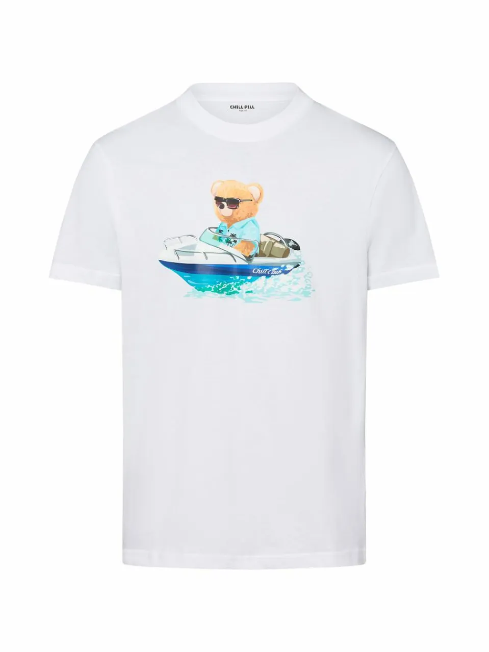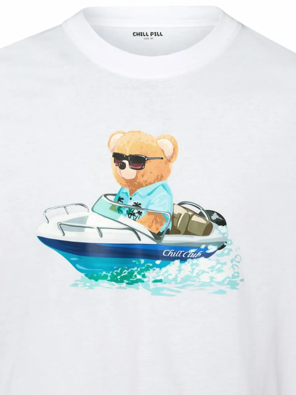 Das Chill Pill T-Shirt Yacht Bear punktet mit seinem humorvollen Frontprint, der einen entspannten Bären in einem Boot zeigt – ein cooler Hingucker zu Jeans, Cargos oder Shorts.