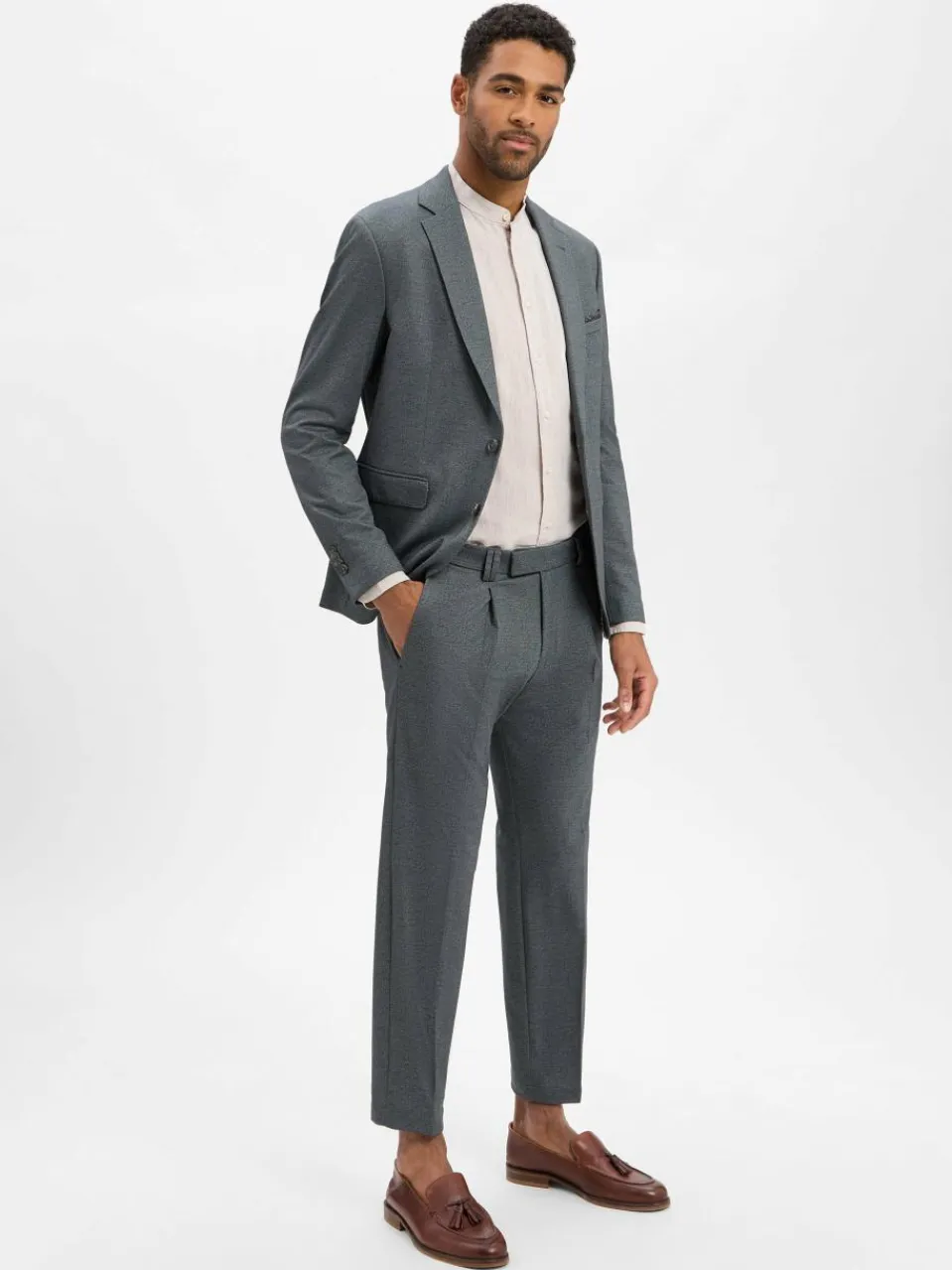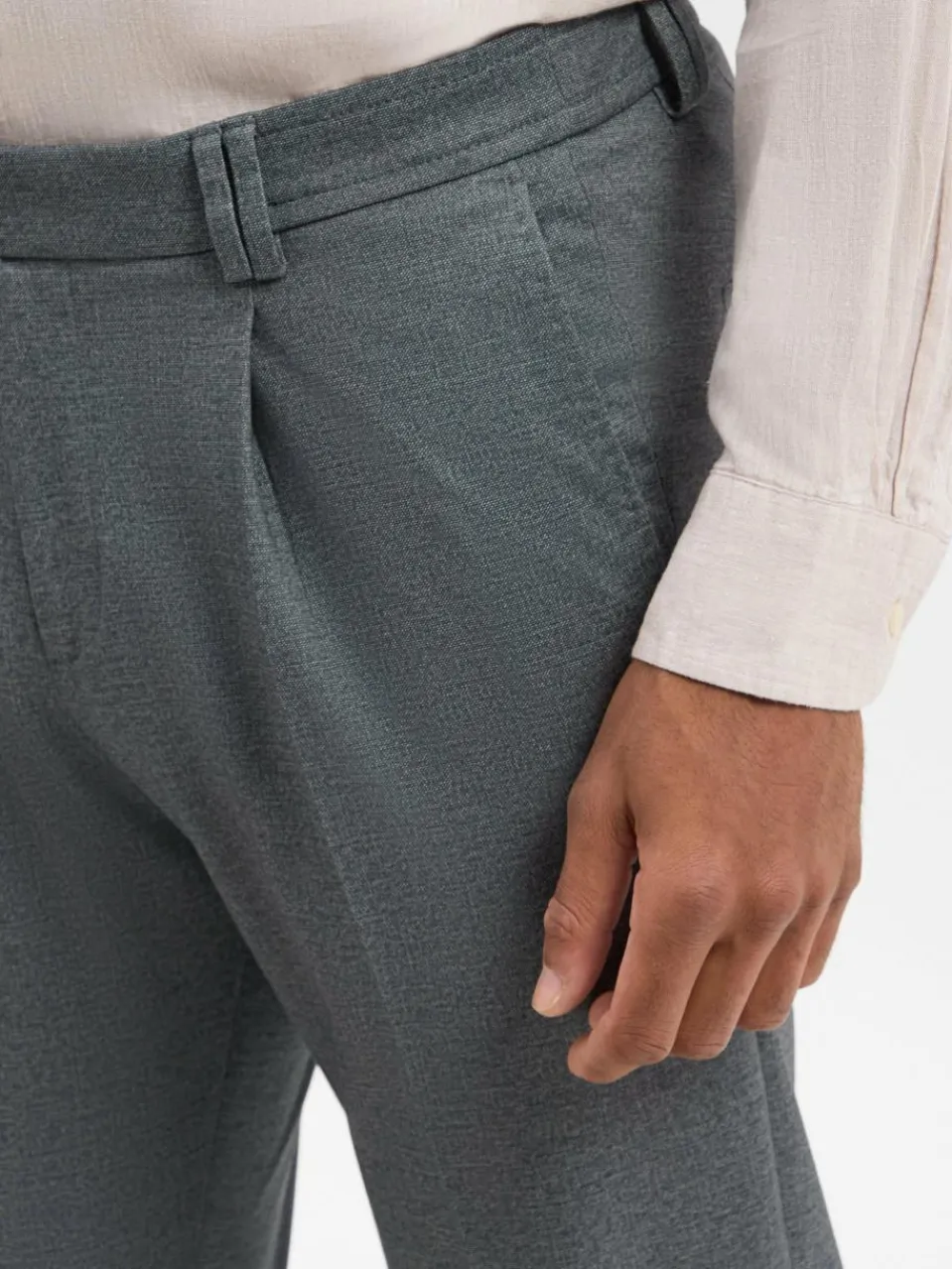 Klassische Bund- und Bügelfalten zieren die Anzughose Cisando von Cinque, doppelte Gürtelschlaufen setzen elegante Akzente. Die Hose ist Teil eines Baukasten-Anzugs, kann aber auch allein getragen werden.