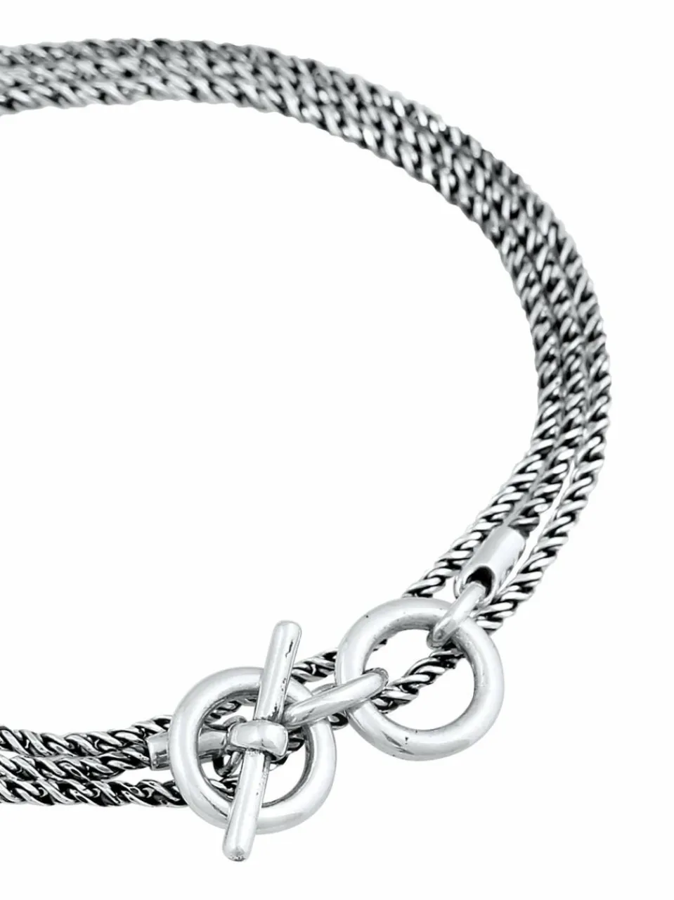 Dieses lässige Armband für den Mann, vereint rundes Design mit oxidierter Oberfläche. Zwei oder dreimal um das Handgelenk geschlungen, bildet die gedrehte 2 mm starke Kette einen stilvollen Kontrast. Ein Highlight des Schmuckstücks, ist die schlichte runde T-Bone Schließe. Das robuste Finish begeistert nicht nur durch seine bemerkenswerte Optik, sondern auch durch seinen Vintage Design, das zum Jeans und Business Outfit passt.