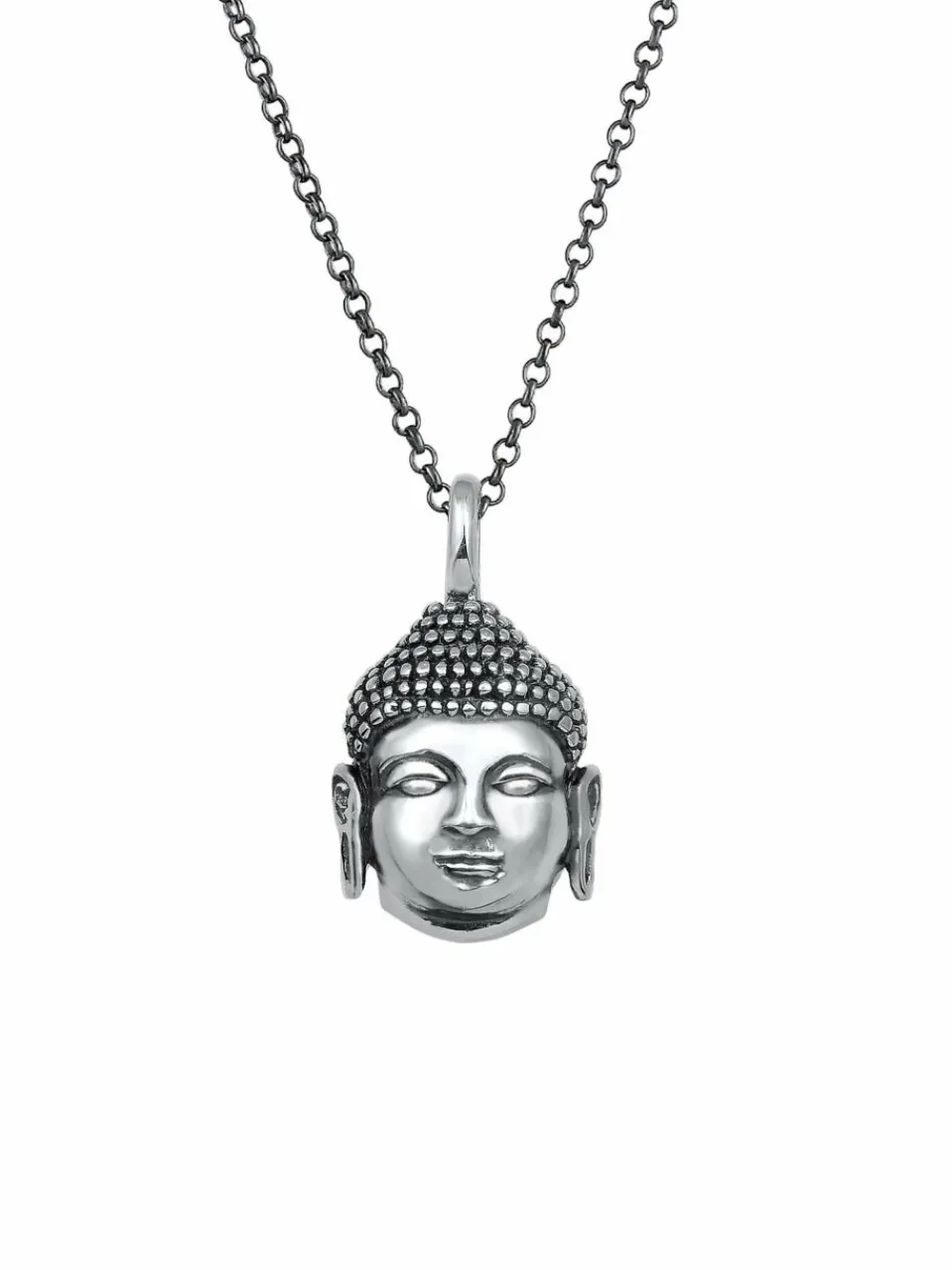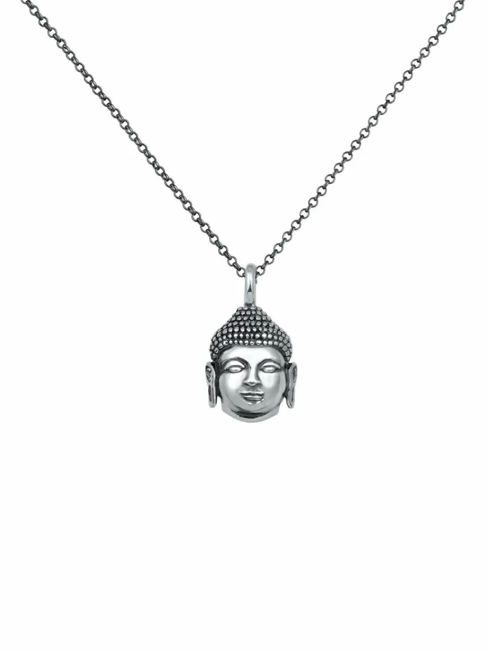 Moderne Herren Halskette mit buddhistischem Anhänger. Das kraftvolle Schmuckstück mit einem Buddha Kopf Anhänger wird im Nu zum neuen Glücksaccessoire. Angesagter Statement Schmuck für alle modebewusst lässigen Männer.