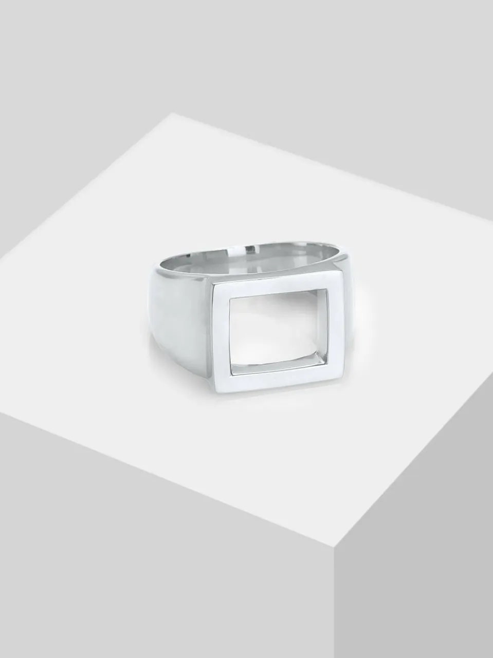 In einer etwas andere Art von einem Siegelring für den Mann, präsentiert dieses angesagte Accessoire. Die Rechteckige Oberfläche des Schmuckstücks ist als Rahmen gearbeitet und in der Mitte offen gestaltet. Eine klare Formgebung und das minimalistisches Design, spiegelt sich in diesem Ring wider. Dieses stilvolles Accessoire, sorgt garantiert für Aufmerksamkeit am Finger des Mannes. Dieses exklusive Schmuckstück wird in einer eleganten Geschenk-Box geliefert.