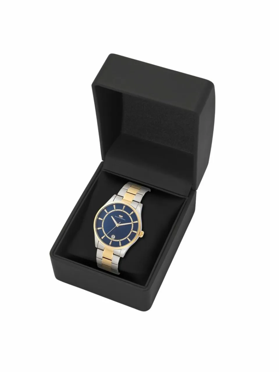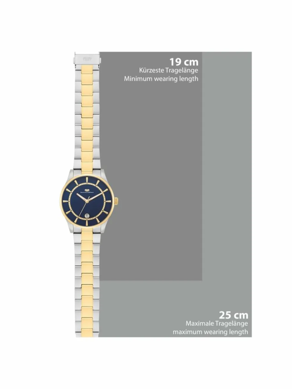 Diese Herrenuhr der Manufaktur Rhodenwald & Söhne vereint stilvolle Eleganz mit den Werten traditioneller Horlogerie. Das dunkle Zifferblatt wird durch markante Strichindizes strukturiert und mit lumineszierenden Obélisque-Zeigern und einer Datumsanzeige kombiniert. Highlight des Designkonzepts ist der Bicolor-Look Silber/Gelbgold mit polierten und satinierten Edelstahl-Elementen, sowohl im Gehäuse als auch im maskulinen Gliederarmband mit Sicherheitsfaltschließe.