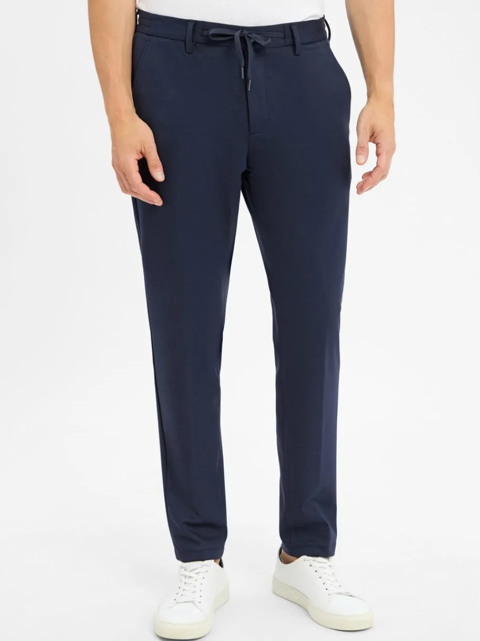 Zwischen casual und smart: Die Jog Pants von s.Oliver Black Label verbinden den Tragekomfort einer Sweatpants mit dem Appeal einer Businesshose. Die Hose ist Teil eines Baukasten-Anzugs, kann aber auch allein getragen werden.