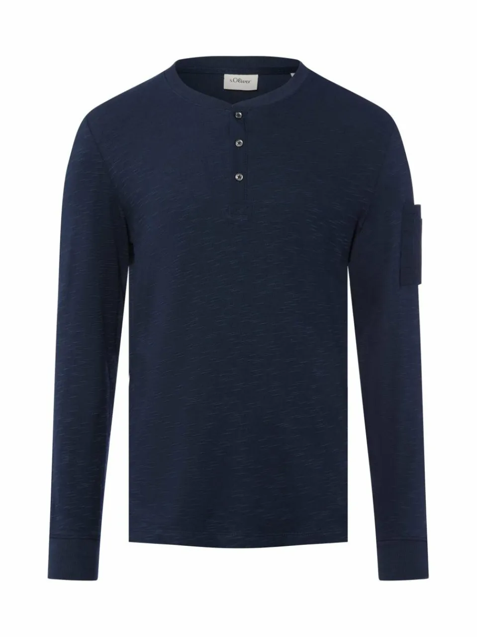 Das Henley von s.Oliver aus Baumwolle mit kurzer Knopfleiste, Organizertasche am Ärmel und Rippbündchen punktet als maritim-sportives Basic mit Flammgarntextur.