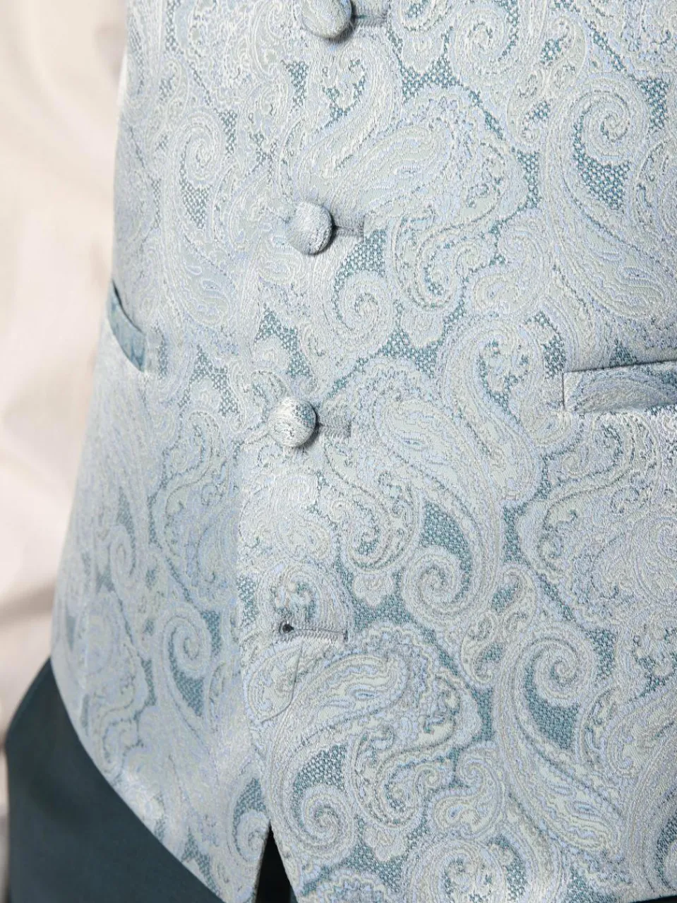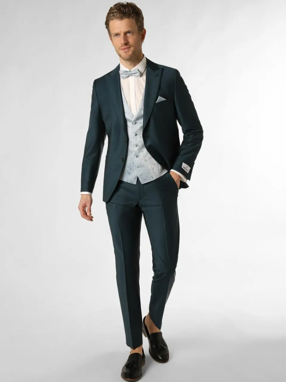 Wenn die Wilvorst Weste mit ihrem edel schimmernden Paisleymuster unter einem Sakko hervorblitzt, zieht sie garantiert die Blicke auf sich. Die Weste ist Teil eines Baukasten-Anzugs, kann aber auch allein getragen werden.