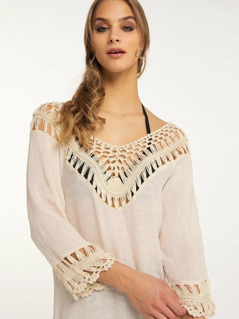 Auf dem Weg zum Strand, im Beach-Cafe oder auf der Beachparty – die Tunika von IZIA möchten wir nicht mehr missen. Sie ist aus einem luftigen, edel glänzendem Material gefertigt und zeigt partielle Häkelelemente, die allesamt von Hand gearbeitet wurden. Tragen Sie das locker fallende Modell über einem Badeanzug oder zu einer schmalen Stoffhose und komplettieren Sie Ihren Look mit Pantoletten und einer Korbtasche.