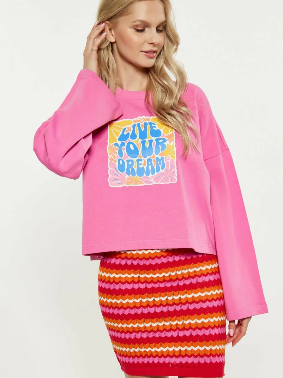 Spice up your casual wardrobe with this cropped sweatshirt with a round neckline and bell-shaped long sleeves. A graphic print with stylized inscriptions surrounded by floral motifs adds a boho touch. Ribbed texture on the neckline, cuffs and hem ensures a snug fit. Perfect for a youthful, festival-inspired look that exudes a laid-back vibe.