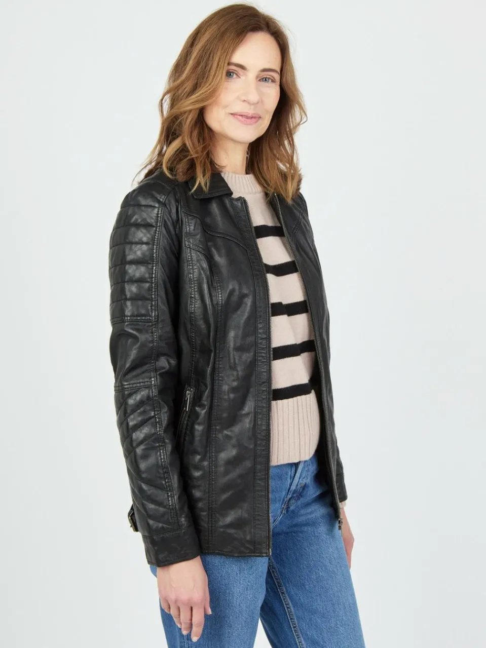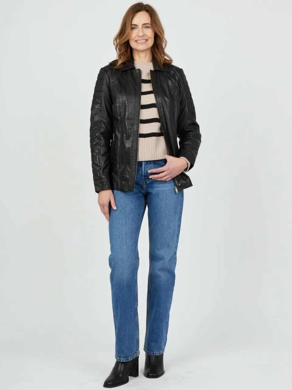 Diese hochwertige Damen-Lederjacke in klassischem Braun verbindet zeitlose Eleganz mit modernen Akzenten. Aufwendig verarbeitete Details wie der elegante Hemdkragen, schöne Perforationen an den Oberarmen oder auch die Ziernähte an den Schultern, Armen und auf der Rückseite machen diese Jacke zum Hingucker. Ein gerader Frontreißverschluss sorgt für einen cleanen Look, während zwei verstellbare Lederriemen an den Seiten eine individuelle Passform ermöglichen. Die dezent integrierten Seitentaschen sorgen für einen angenehmen Komfort, während die leichte innere Fütterung eine angenehme Wärme an kalten Tagen garantiert.