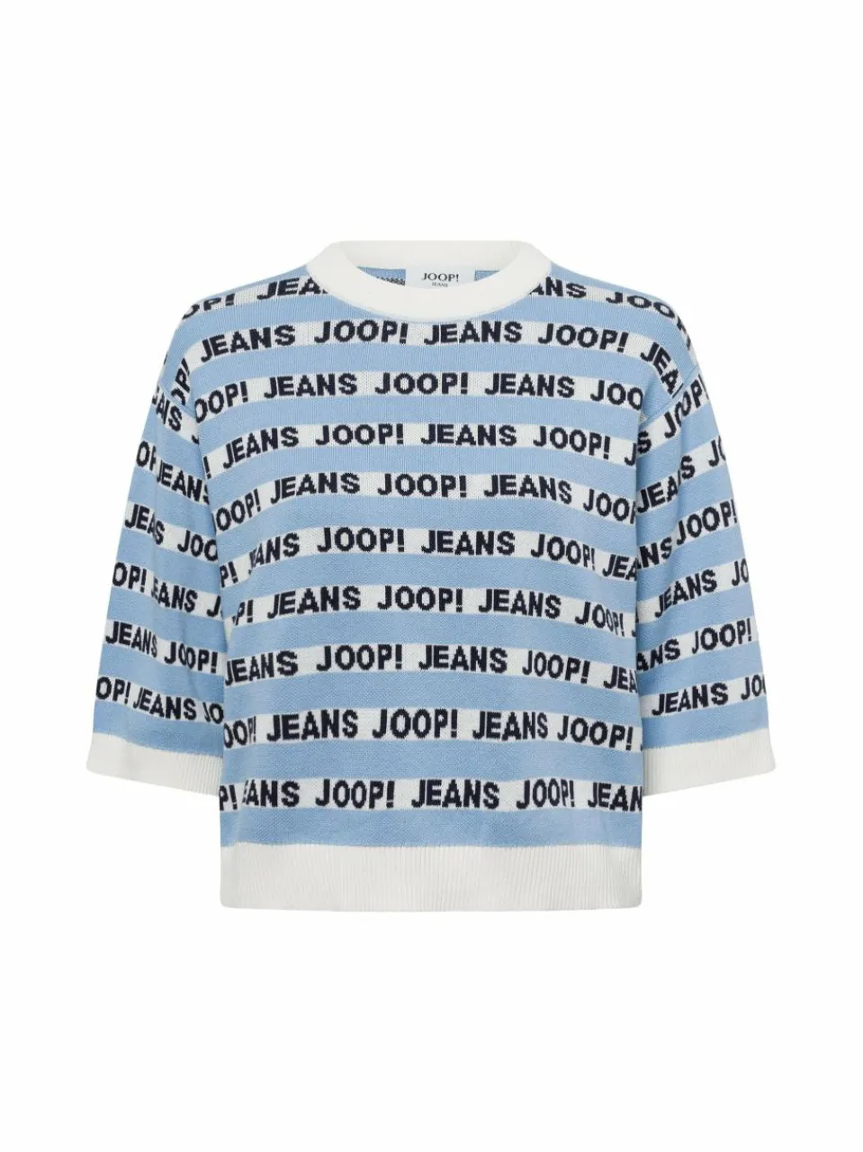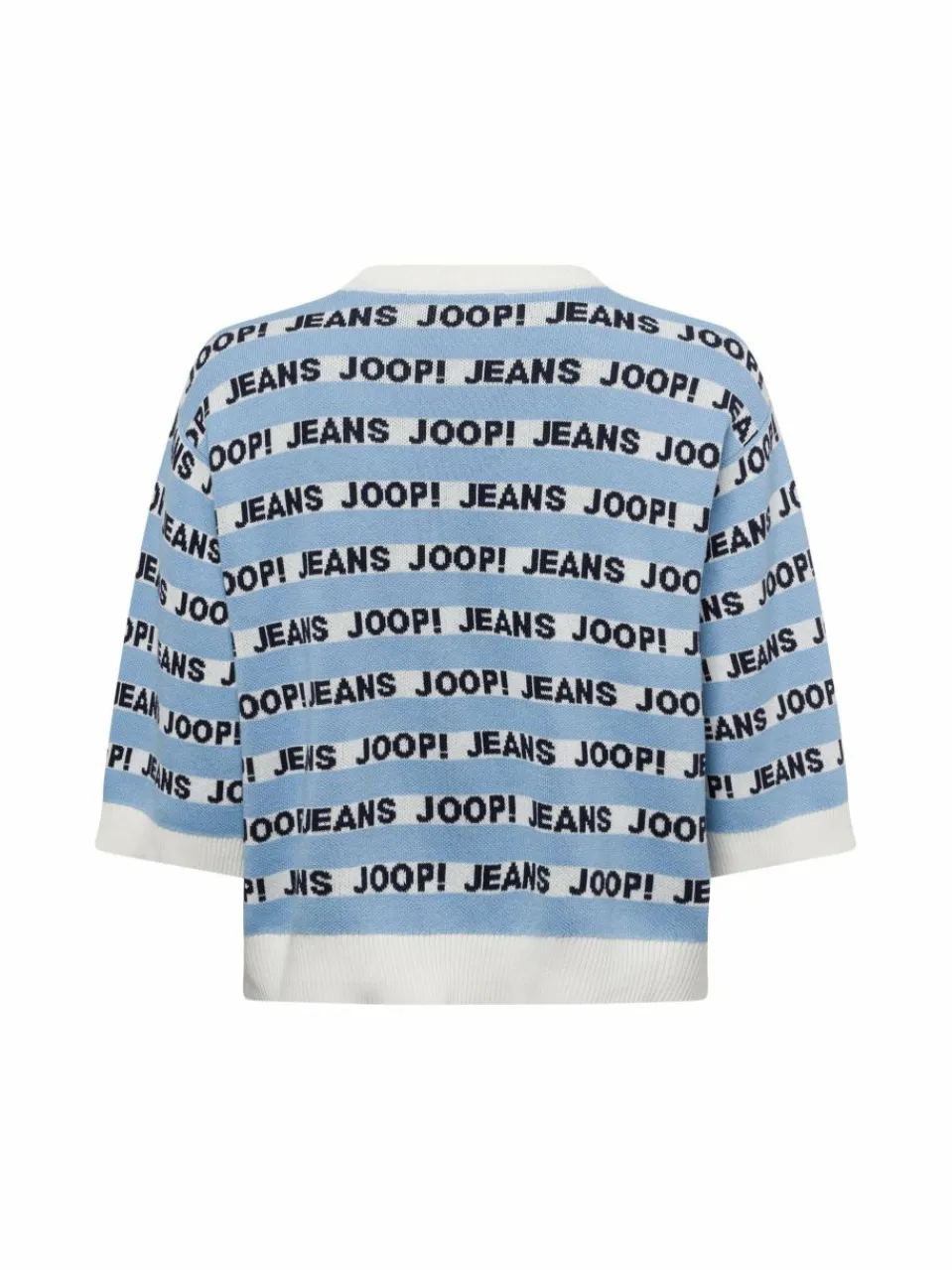Der Joop Jeans Strickpullover Kolinda überzeugt mit seinem modernrn Crop-Schnitt, den halben Ärmeln und dem aufälligen All-Over Marken-Design.