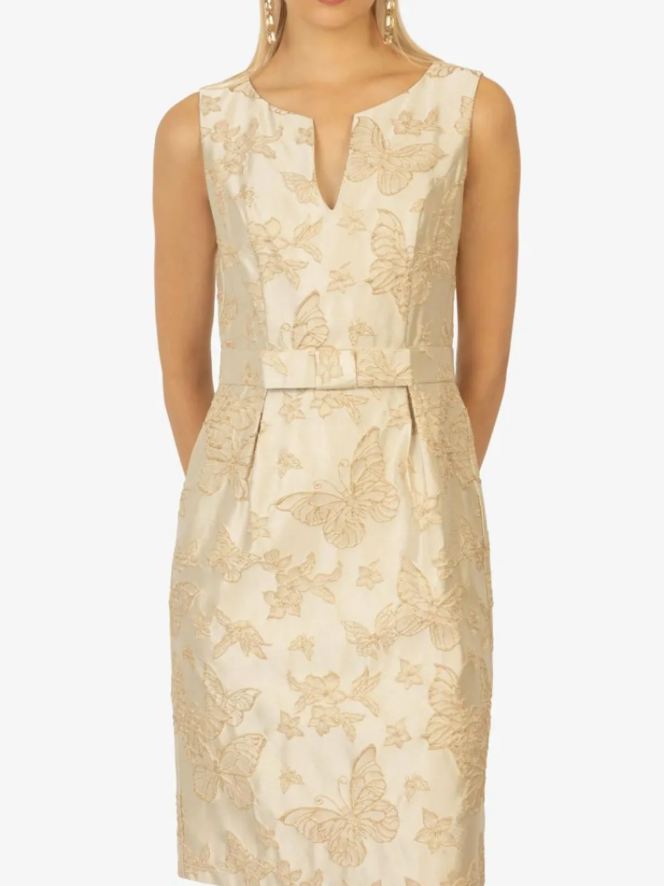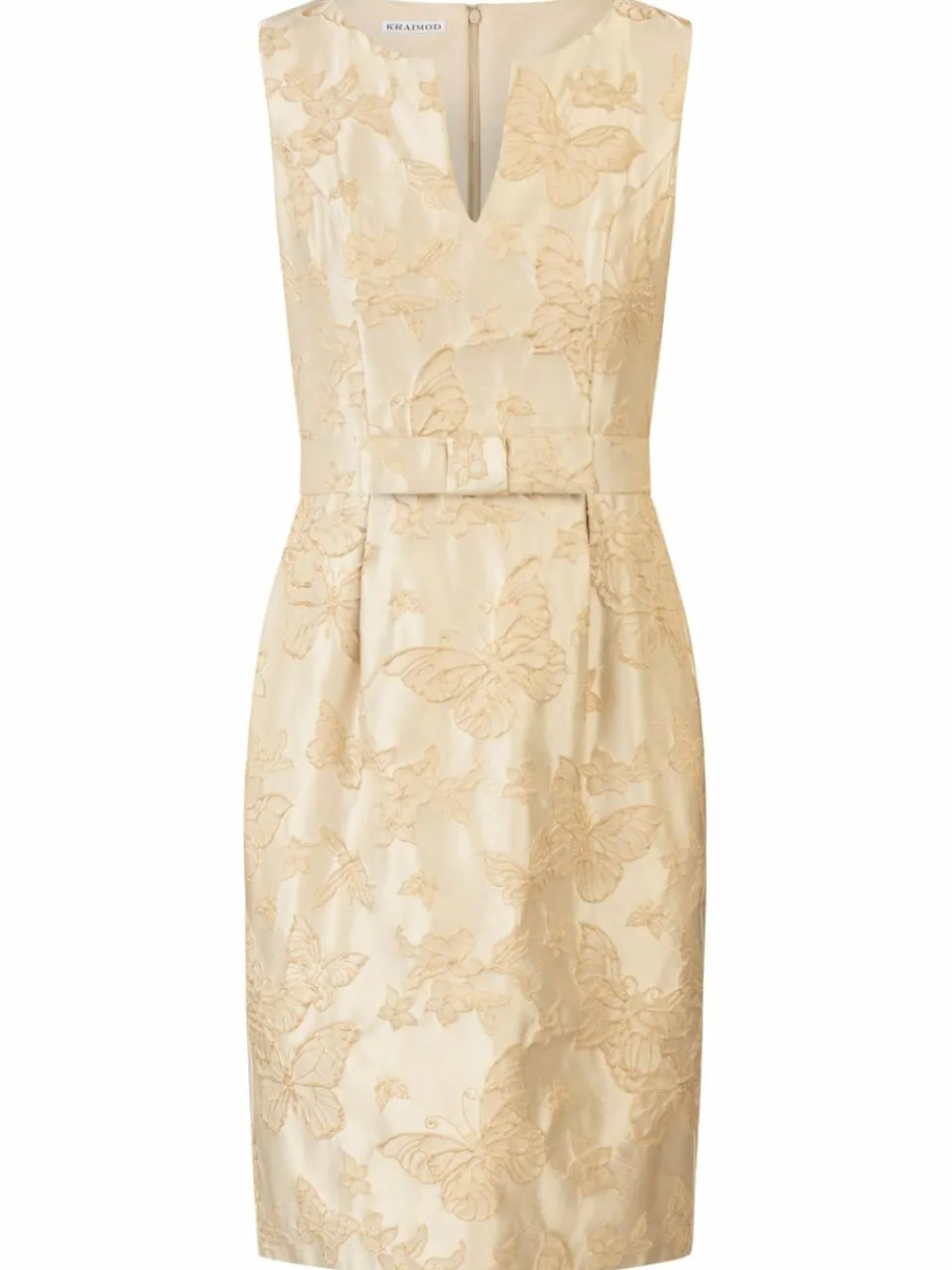 Dieses stilvolle Cocktailkleid verbindet klassische Eleganz mit modernem Stil. Der V-Ausschnitt und das ärmellose Design sorgen für einen femininen Look, während die feine Jacquard-Struktur dem Kleid eine raffinierte Note verleiht. Die taillierte Passform mit dezentem Gürtel-Effekt akzentuiert die Figur und betont die Silhouette. Dank seiner Knielänge ist das Kleid ideal für besondere Anlässe, Hochzeiten oder elegante Abendveranstaltungen. Der verdeckte Reißverschluss am Rücken sorgt für einen mühelosen Einstieg.