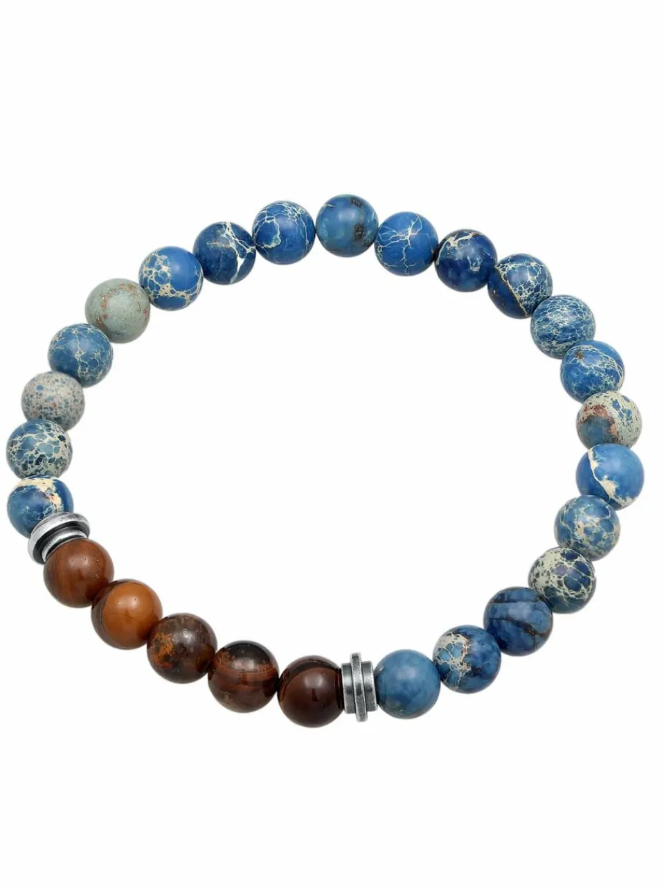 Ein top modisches Accessoire ist dieses stylische Armband für Männer aus hochwertigem, oxidiertem 925er Sterling Silber und blau gefärbten Achat Kugeln. Das Mittelteil dieses Stretcharmband ist mit Tigerauge-Perlen und Silber Beads versehen. Dieses coole, lässige Armband wertet jedes Männeroutfit auf. Das trendige Steinarmband ist ein absolutes Muss für modebewusste Männer.Das Armband ist in drei Größen erhältlich: 19 cm, 21 cm und 23 cm.
