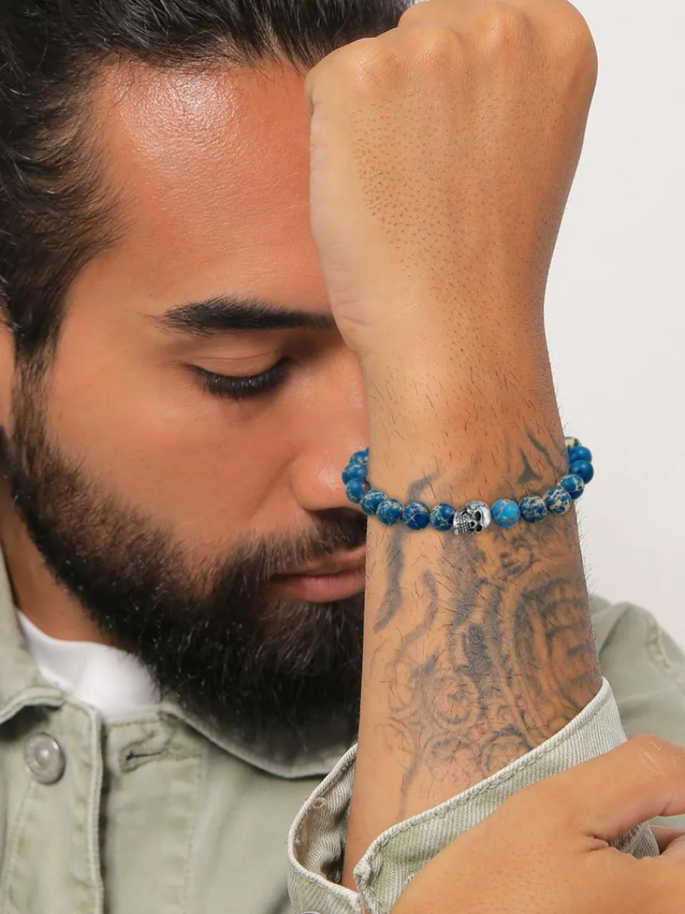 Ausdruckstarkes Herrenarmband für Männer aus blau gefärbten Achat Edelstein Perlen. Dieses maskuline Schmuckstück schafft mit seinem robusten Totenkopf Design einen coolen und lässigen Look und ist durch den Gummizug sehr flexibel. Das trendstarke Accessoire ist bei den modebewussten Männern ein idealer Begleiter.Für Frauen, die ein markantes Armband suchen, eignet sich die Länge von 19 cm. Die Farbe und Struktur der Schmucksteine können vom Bild abweichen, da es sich um Naturprodukte handelt. Daher ist jede Armband individuell.