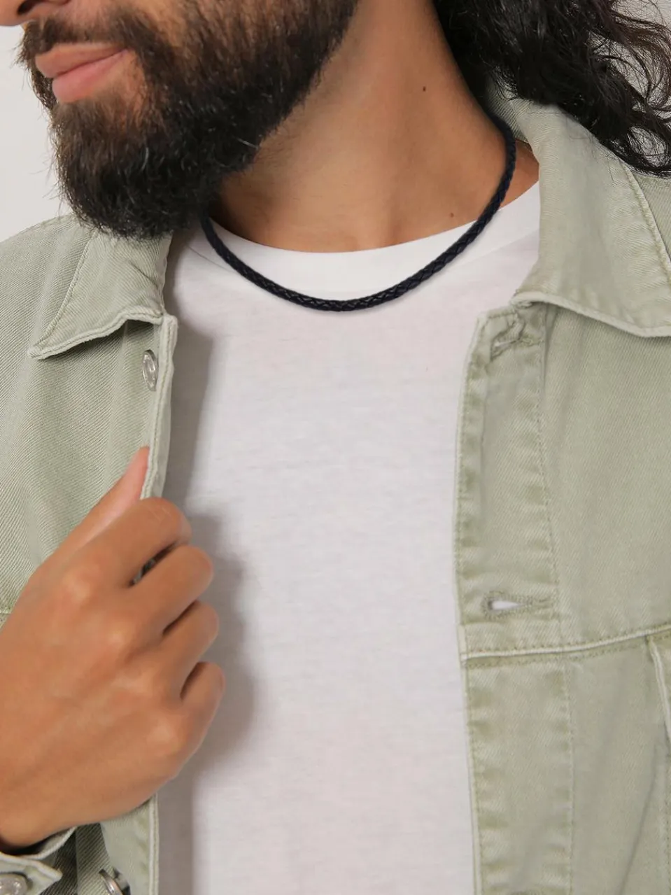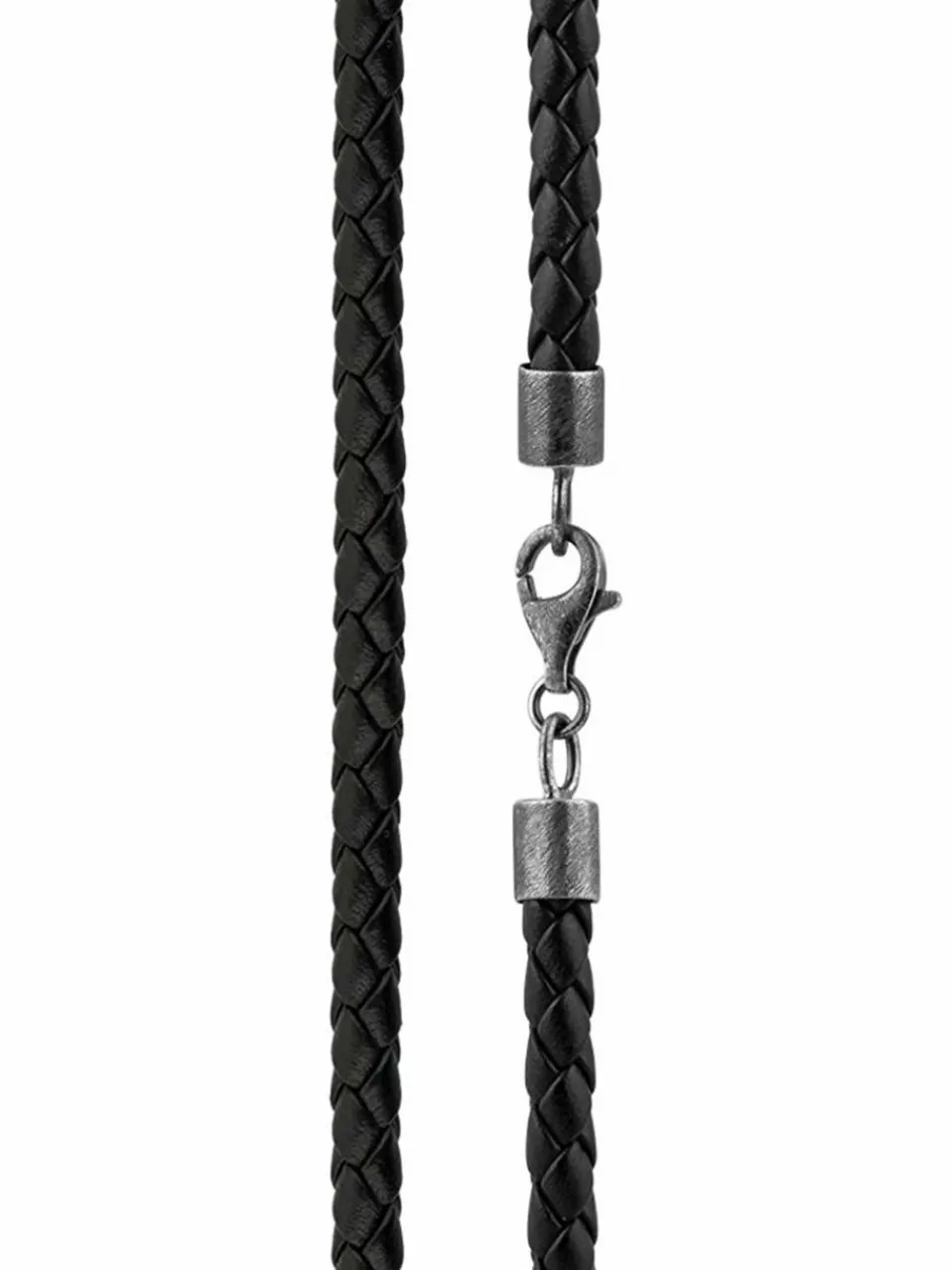 Eine schlichte geflochtene Kuzzoi Leder Halskette aus schwarzem Rindsleder mit massivem Karabinerverschluss gefertigt aus 925er Sterling Silber. Die Endösen sowie der langlebige Verschluss wurden oxidiert was der Herrenkette Charakter und Lässigkeit verleiht. Das perfekte Accessoire für jeden größeren Anhänger.Da es sich bei Leder um ein Naturprodukt handelt, kann dessen Farbe und Stärke vom Bild abweichen. Jedes Schmuckstück ist daher individuell und bekommt mit der Zeit eine persönliche Patina. Dieses exklusive Schmuckstück wird in einem eleganten Geschenk-Etui geliefert.