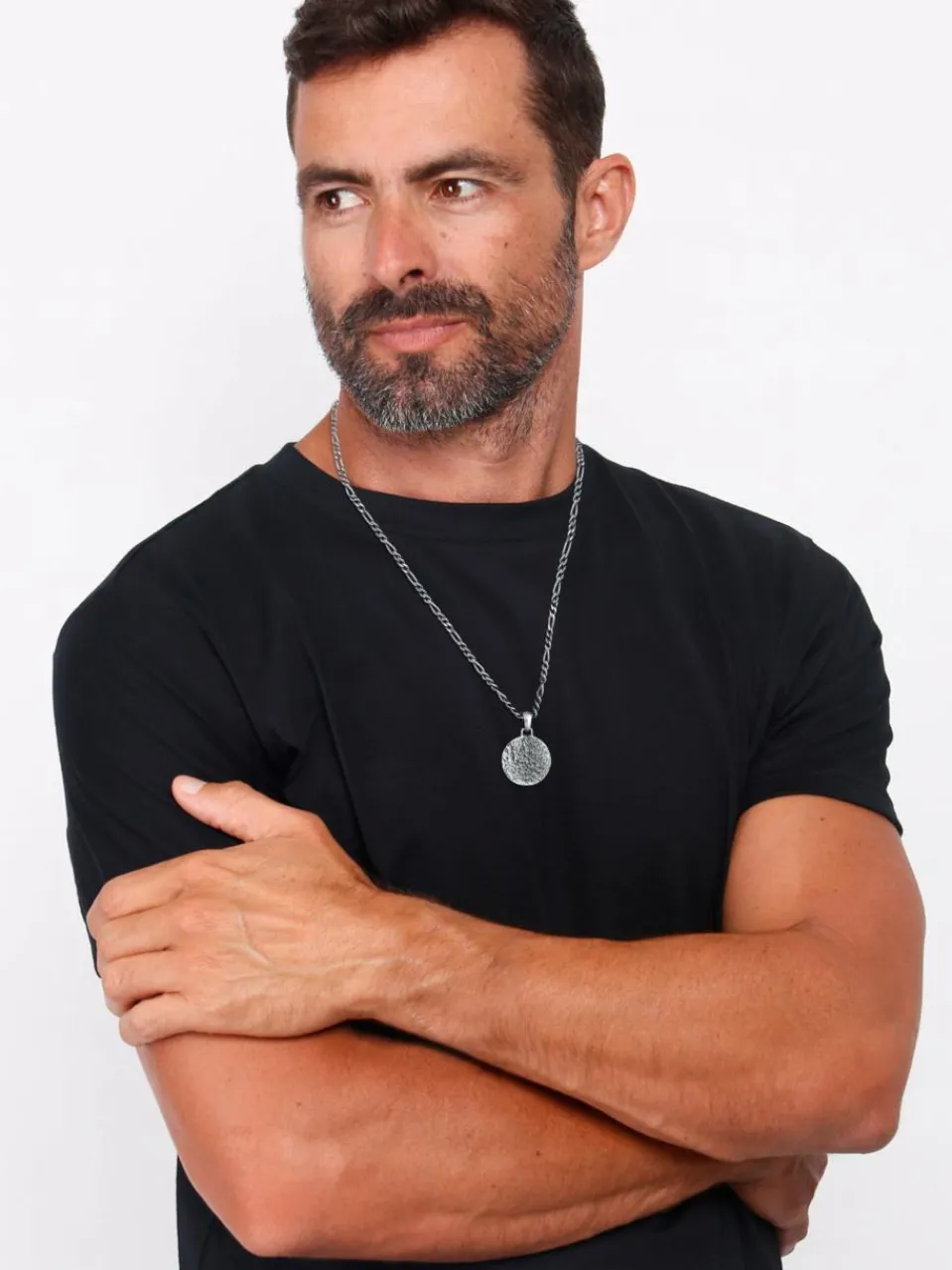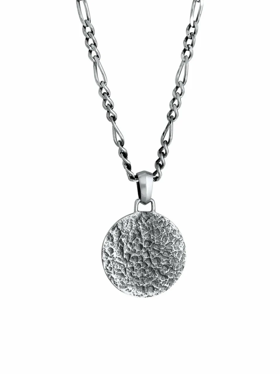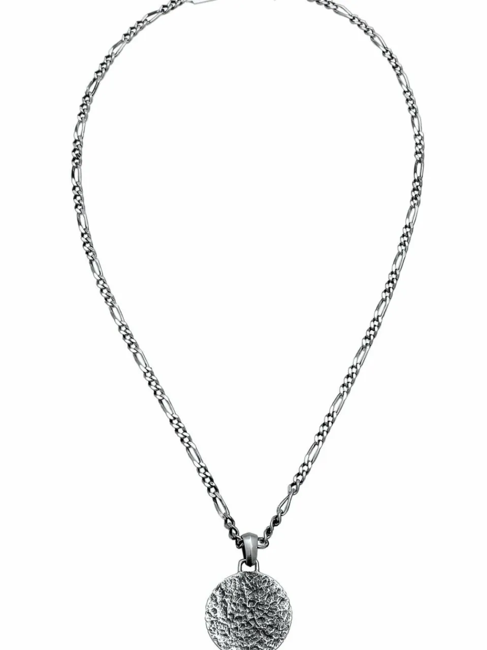 Lässige und maskulin präsentiert sich diese Halskette für den Mann, im einzigartigen Design. Die robuste Figaro Kette setzt ein runder Plättchen Anhänger mit kunstvoll gehämmerter Oberfläche in Szene. Dieses Schmuckstück im angesagte Vintage Look, kleidet jeden Mann perfekt. Dieses exklusive Schmuckstück wird in einer eleganten Geschenk-Box geliefert.
