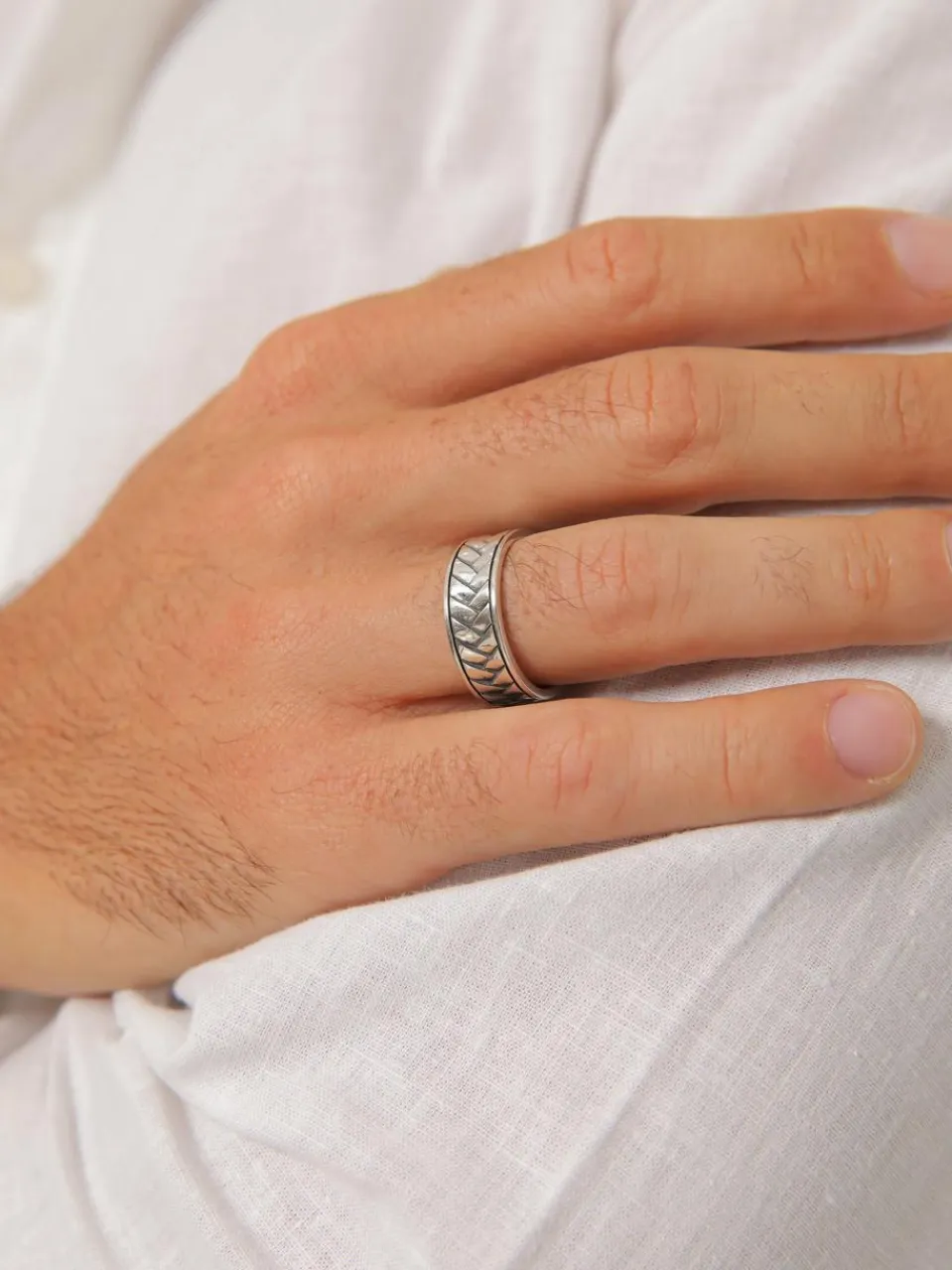 Dieser massive Herren Ring, unterstreicht den lässig legeren Look. Der geradlinig geformte Bandring ist mit einer Struktur die einer Fischgräte ähnelt verziert. Die teilweise geschwärzte Oberfläche setzt gezielt Akzente. Ein markantes Schmuckstück im als täglicher Begleiter, das den persönlichen Look eines Mannes optimal unterstreicht.