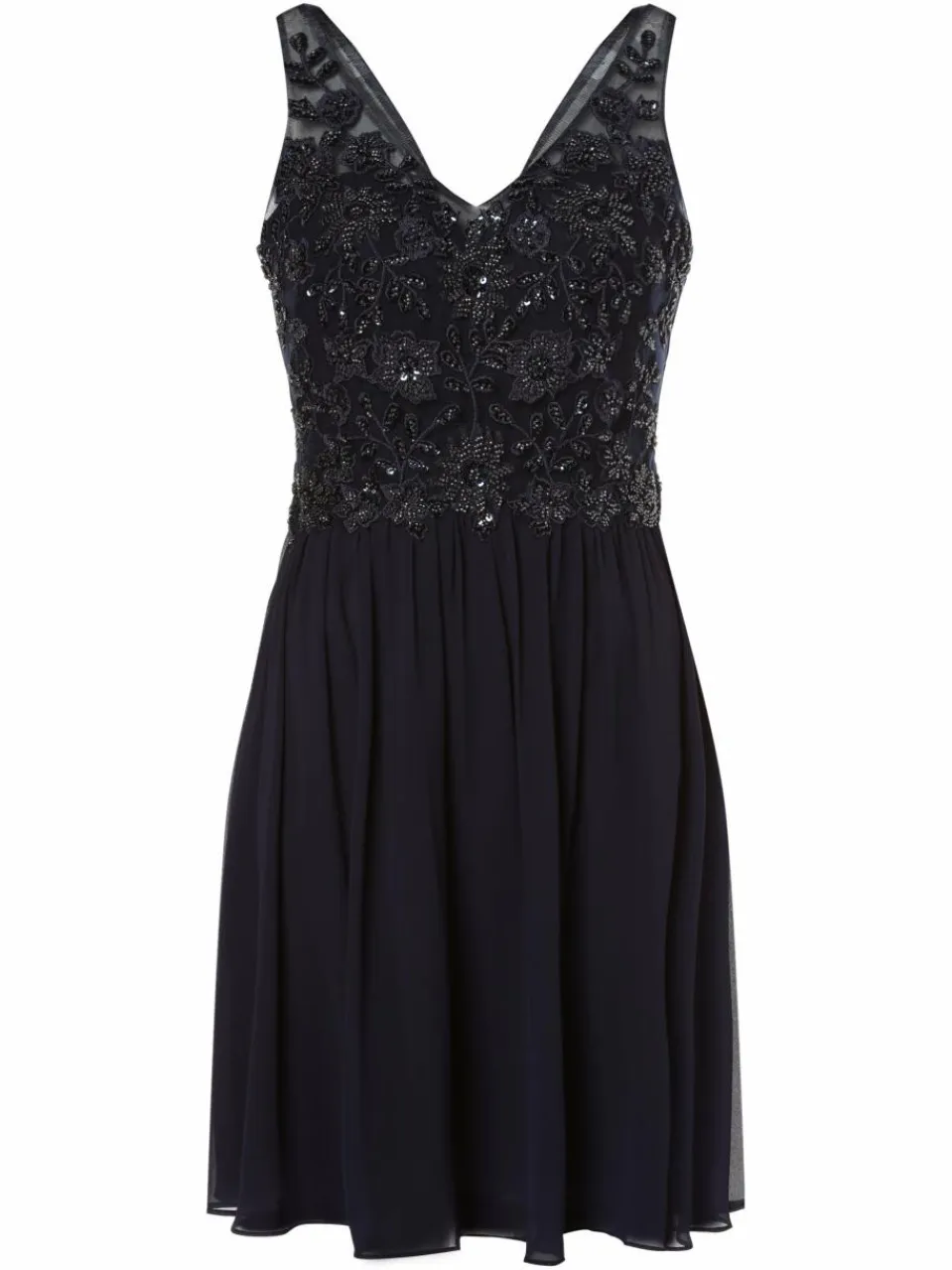 Florale Stickereien mit Perlen und Pailletten bestimmen den Glam-Faktor des kurzen Abendkleids von Laona.