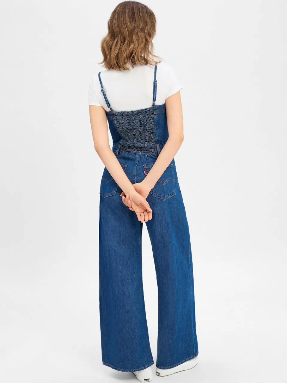 Der Denim-Jumpsuit von Levi’s kreiert mit dem Oberteil in Corsagen-Optik sowie dem weit ausgestellten Beinverlauf eine coole Silhouette – perfekt für angesagte Streetwear-Stylings und Party-Looks.