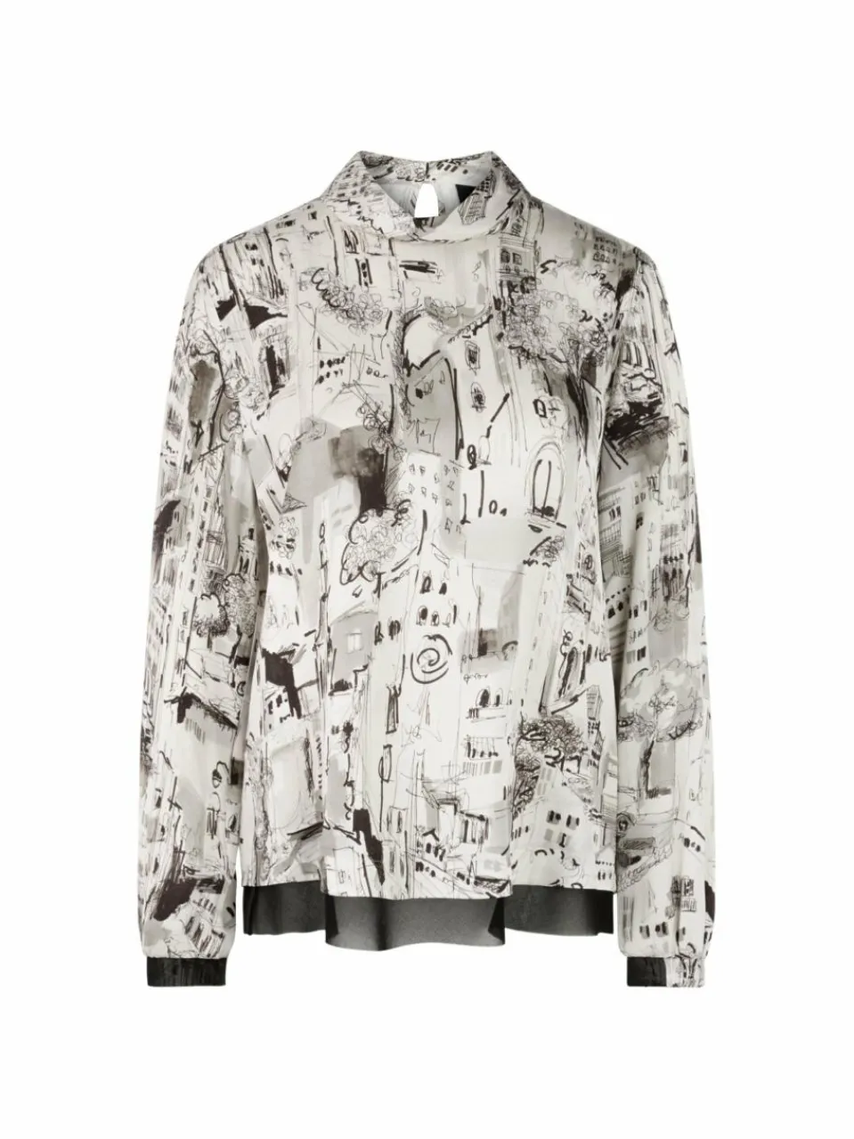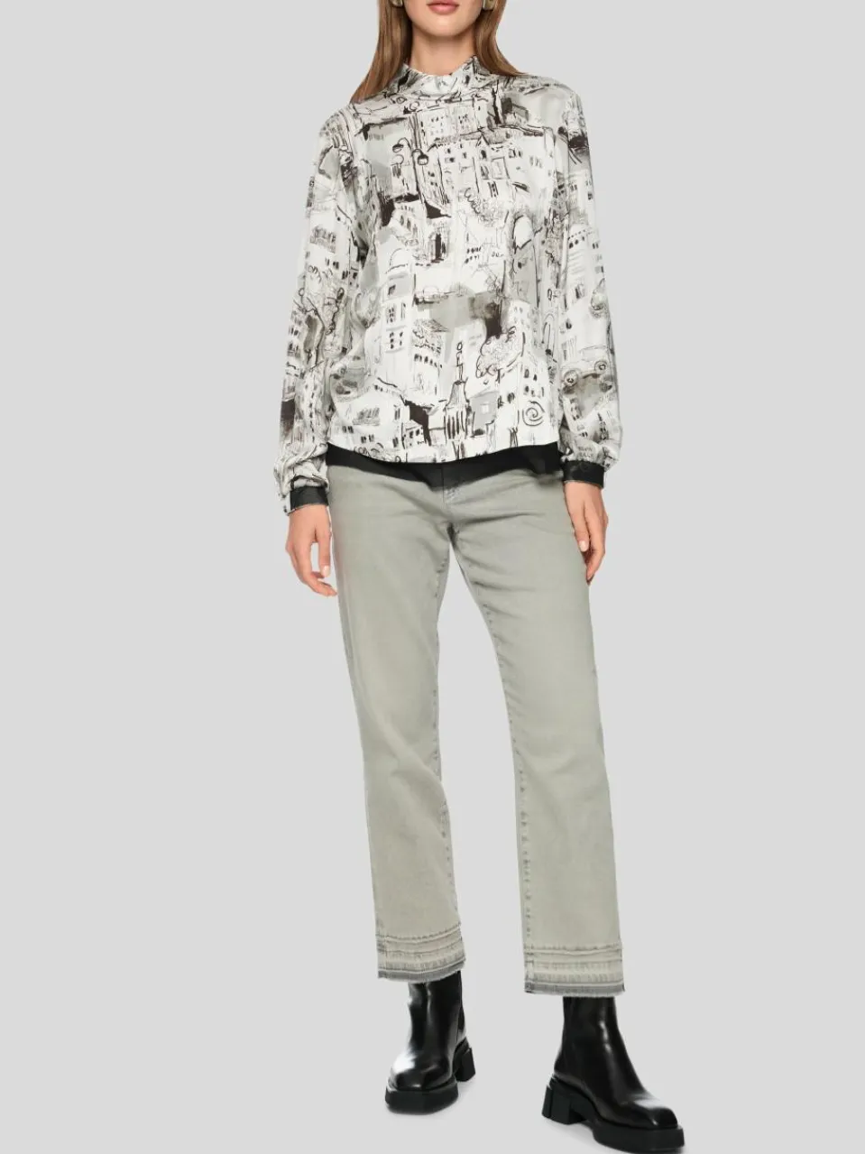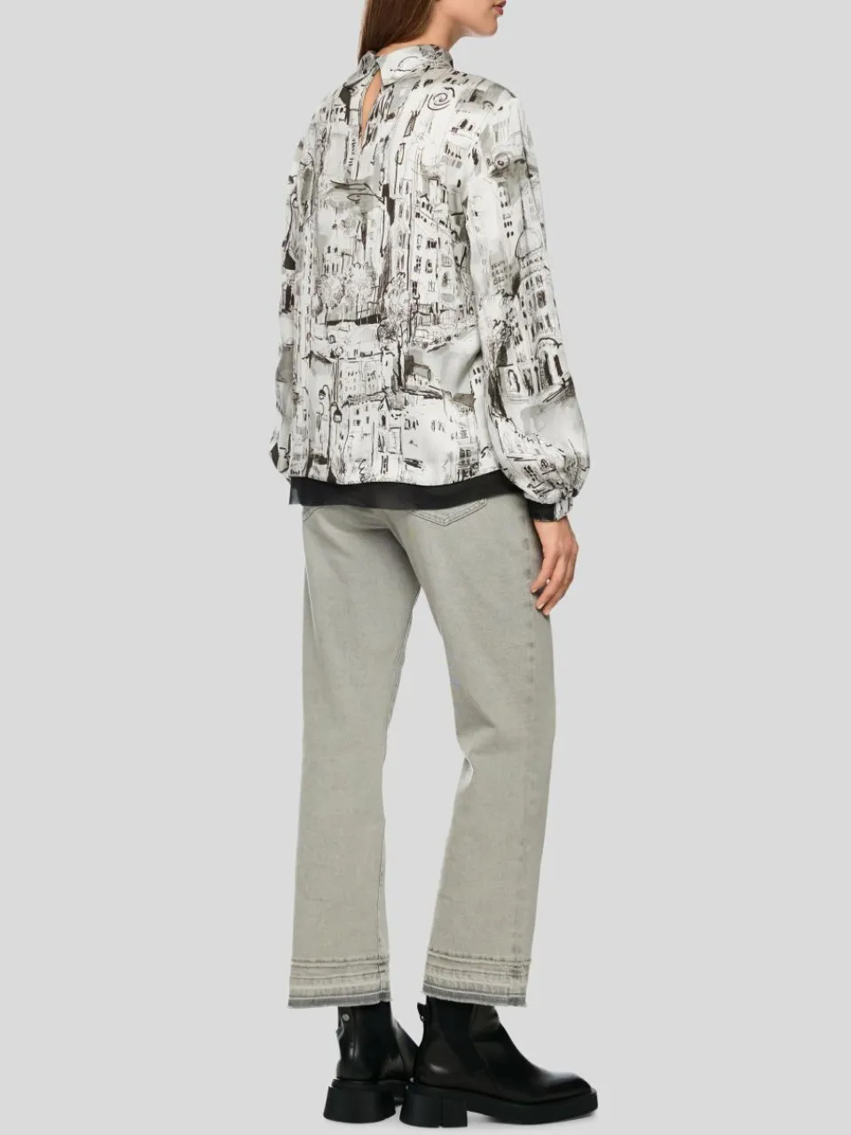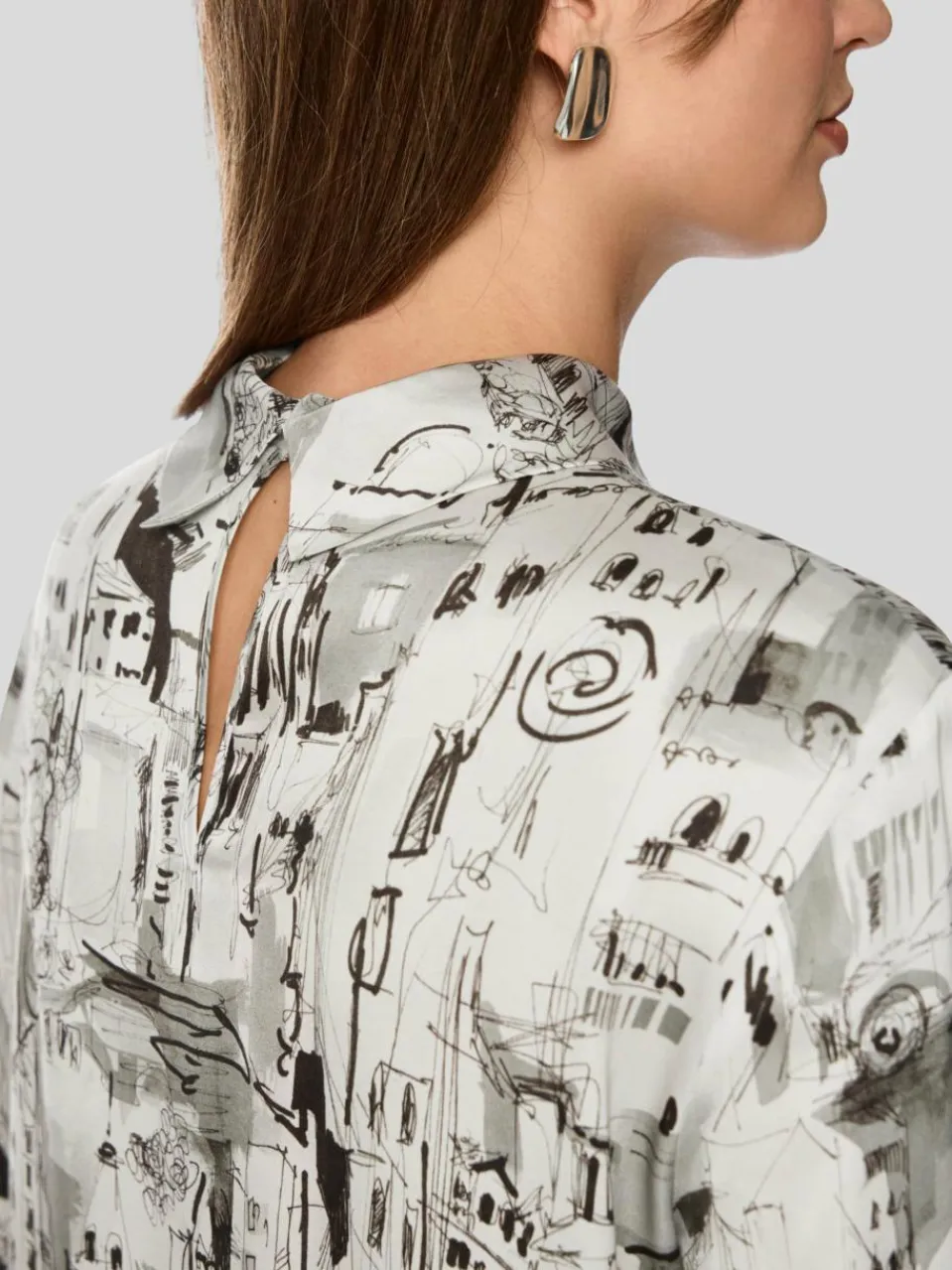 Moderne Bluse aus fließender Viskose mit lockerem Schnitt und CITY-Motiv in handgescribbelter Optik. Voluminösere Ärmel mit gerafften Bündchen und unifarbener Saumbesatz setzen modische Akzente. Der Schlitz mit Knöpfen im Nacken rundet das Design feminin ab – perfekt für stylische City-Looks.