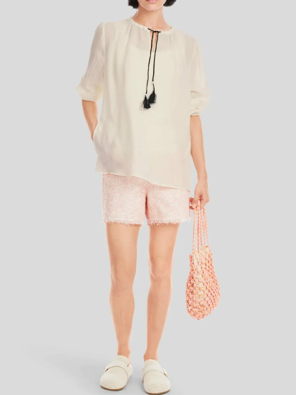 Sommerlich präsentiert sich diese Bluse mit ihrem zarten Ramie. Passend dazu präsentiert sie eine weite Silhouette mit geschlitztem Rundhals. Eine Kordel mit Quaste dient als schmückender Verschluss. Die Schlupfbluse hat lange Ärmel mit schmalen Bündchen.