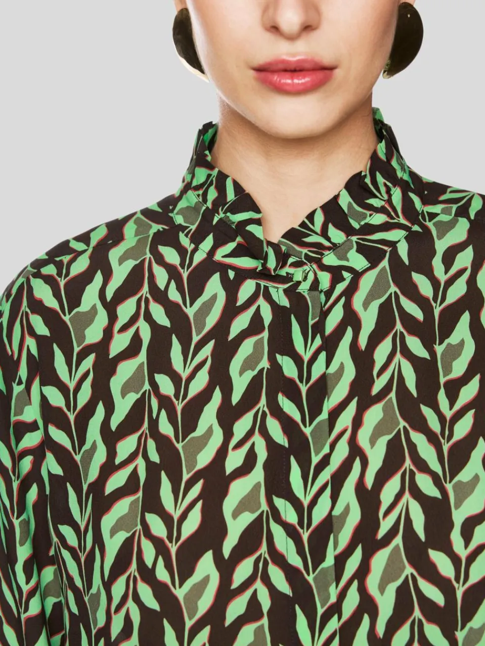 Das florale Muster macht diese Bluse zu einem echten Hingucker. Sie ist aus 100% Viskose gefertigt und damit luftig-leicht und sehr angenehm zu tragen. Die Knopfleiste ist verdeckt und sie besitzt einen geraden Schnitt. Den Stehkragen und Ärmelsaum zieren kleine Volants und farbliche passende Knöpfe um quadratischen Design.