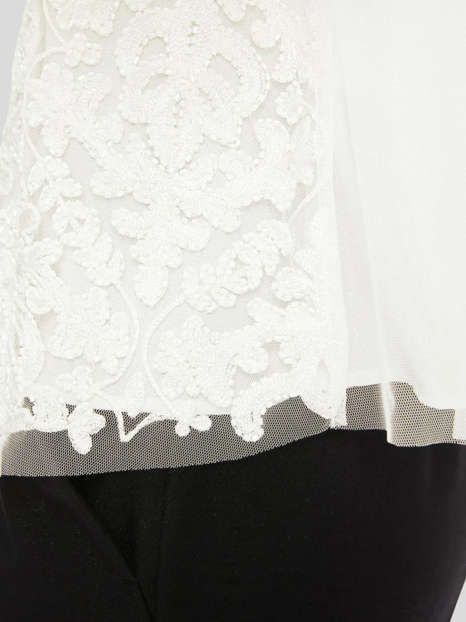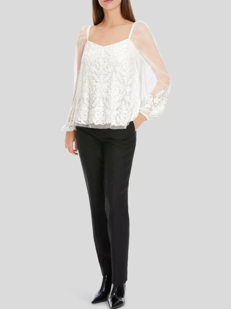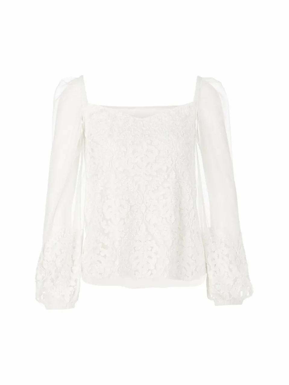 Zarte Spitze kombiniert mit hochwertiger Perlen-Stickerei verleiht dieser weich fließenden Bluse einen Hauch von Opulenz. Passend dazu präsentiert sie eine leichte A-Form mit weitem Ballonärmel. Der tiefe Ausschnitt in Karree-Form betont das Dekolleté. Das Material ist am Rumpf mit einem Top unterlegt, die Ärmel sind transparent.