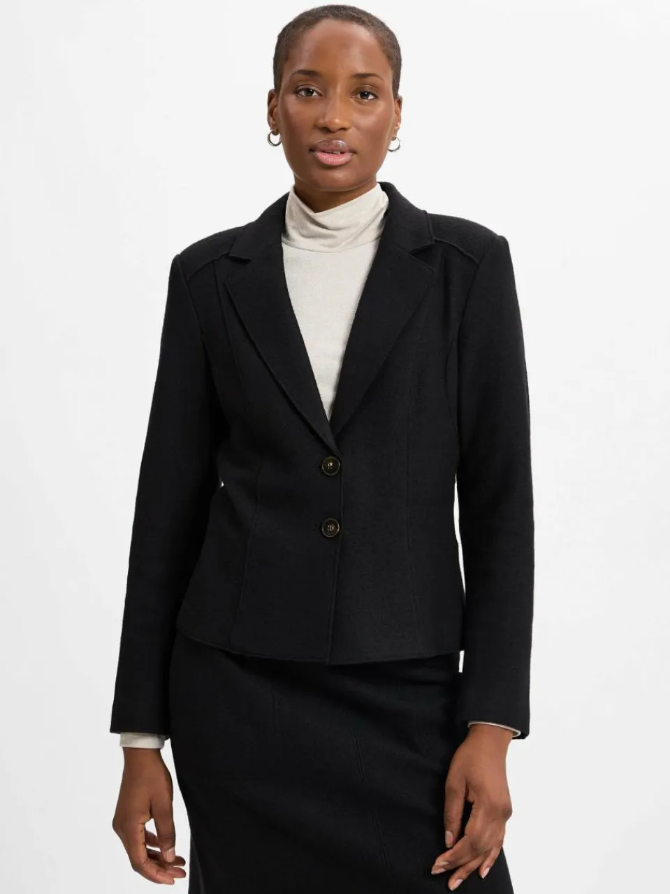 Der elegante, taillierte Blazer von Marc Cain aus hochwertiger Wolle entfaltet zusammen mit dem passenden Rock eine harmonische Kombination, die an kühleren Tagen zum idealen Begleiter für stilvolle Businesstrips wird.