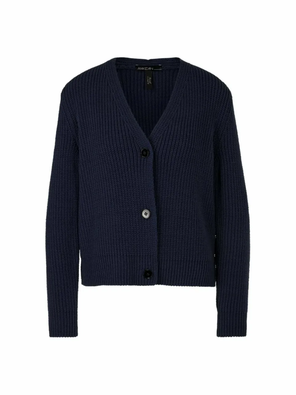 Dieser Cardigan präsentiert einen legeren Rippenstrick. Er hat eine lockere Silhouette und einen V-Neck. Geschlossen wird die Jacke mit Knöpfen. Das Modell ist aus einem soften Baumwollmix „Knitted in Germany“: Das Verstricken der Garne auf hochmodernen Strickmaschinen und die Veredelung der Stoffe geschehen am Standort Deutschland. Zusammengenäht werden die einzelnen Teile wie Ärmel, Vorderteil etc. in europäischen Partnerbetrieben.