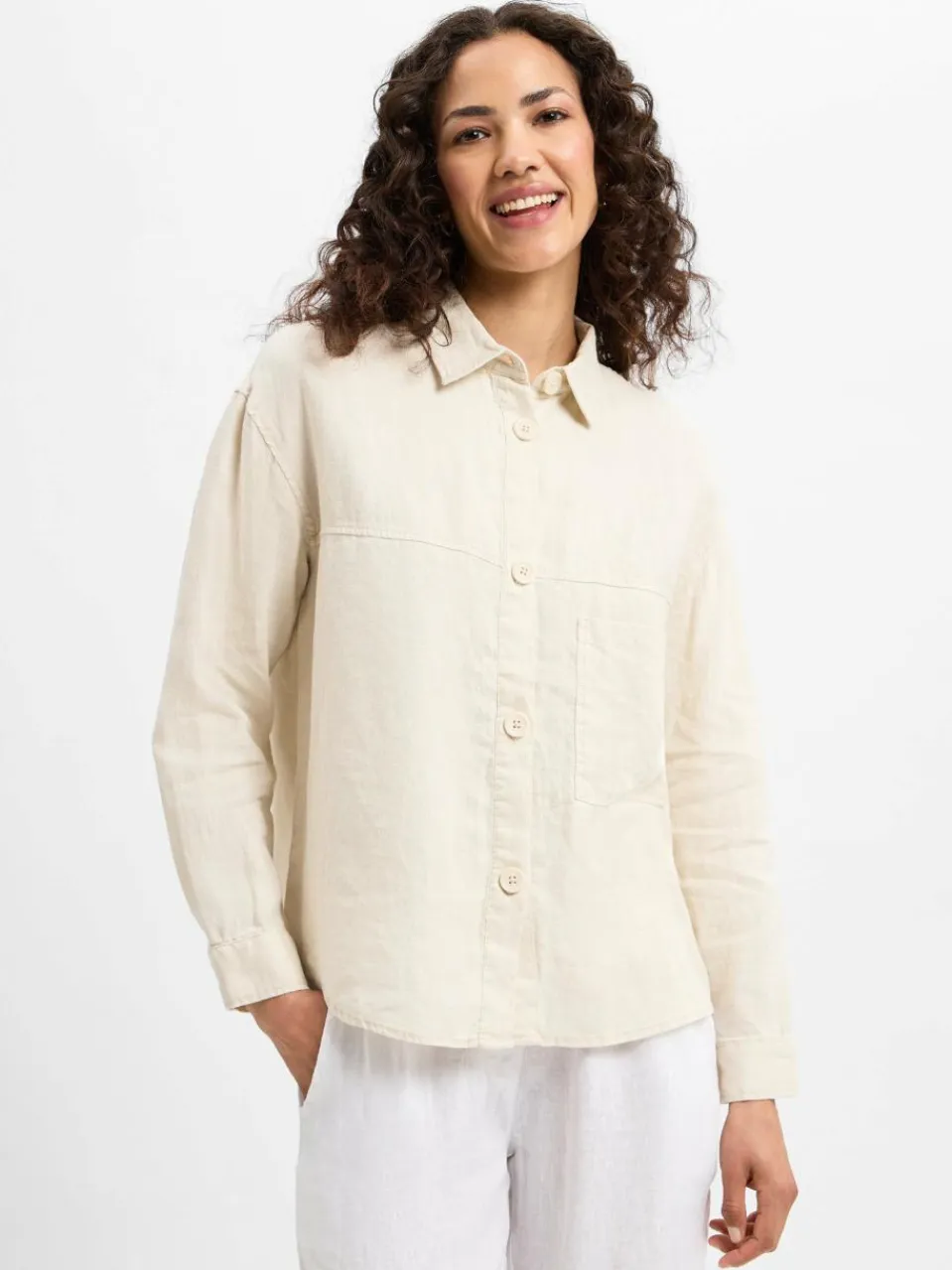 Die Leinenbluse von Marie Lund im Overshirt-Stil kombiniert natürliche Leichtigkeit mit strukturierter Eleganz – ideal für stilvolle Layering-Looks an sonnigen Tagen.