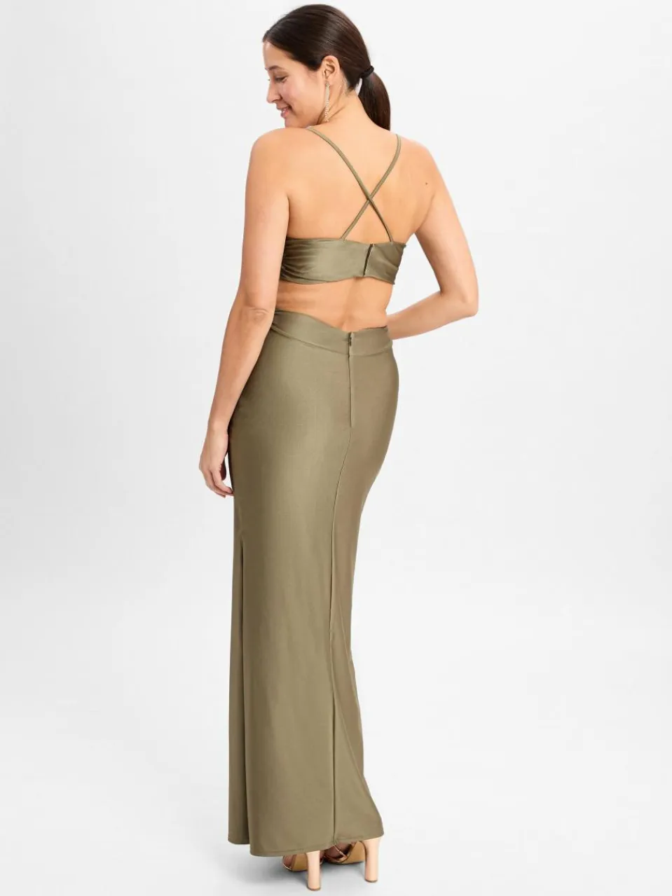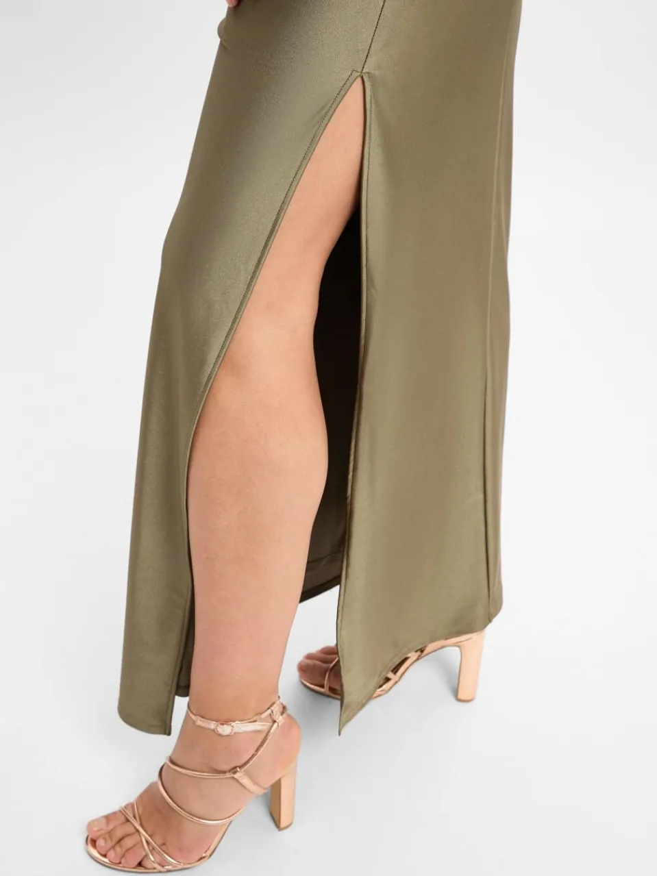 Das lange Abendkleid von Marie Lund verzaubert mit fließender Satin-Qualität, einem eleganten Wickelausschnitt mit gekreuzten Trägern und einem hohen Beinschlitz für einen Hauch raffinierter Eleganz.