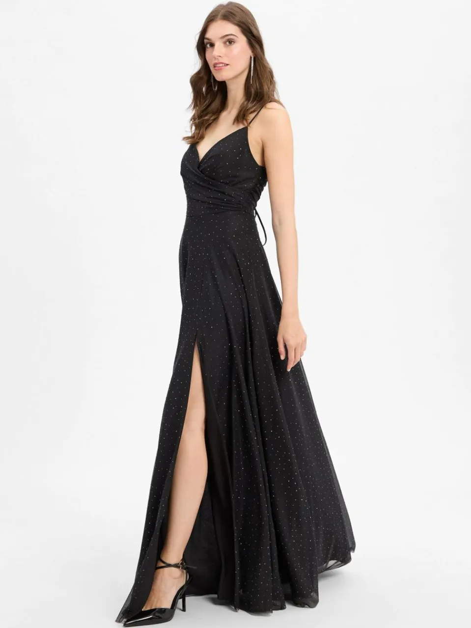 Über und über mit Ziersteinen besetzt funkelt das Abendkleid von Marie Lund mit dem Sternenhimmel um die Wette – die Schnürung am Rücken sowie Raffungen und der Beinschlitz ergänzen stilvolle Design-Elemente.