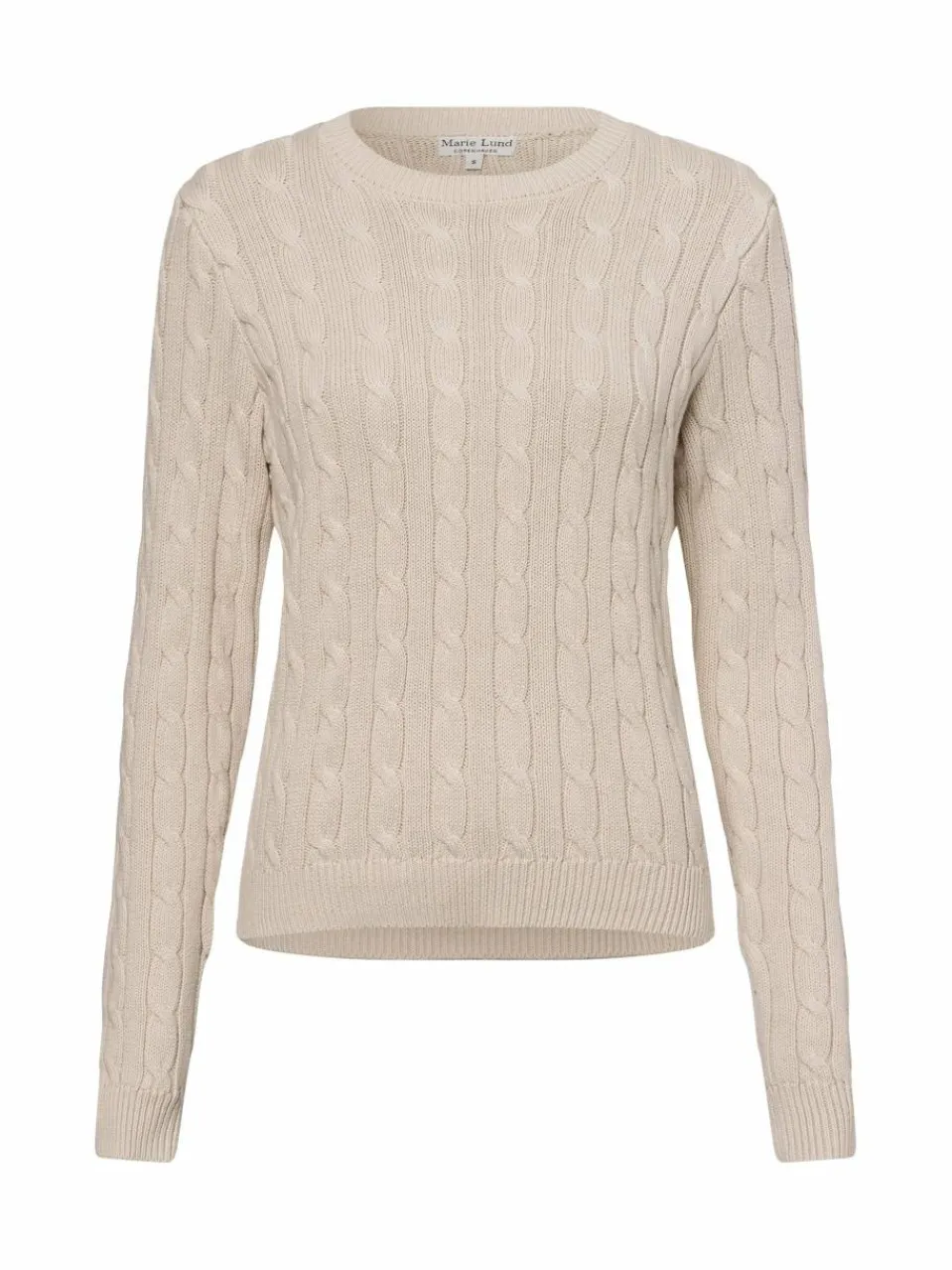 Der grobe Strickpullover von Marie Lund besticht durch sein klassisches Zopfmuster und den Rundhalsausschnitt. Mit den gerippten Bündchen an den Ärmelabschlüssen und am Saum sorgt er für eine perfekte Passform und angenehmen Tragekomfort.