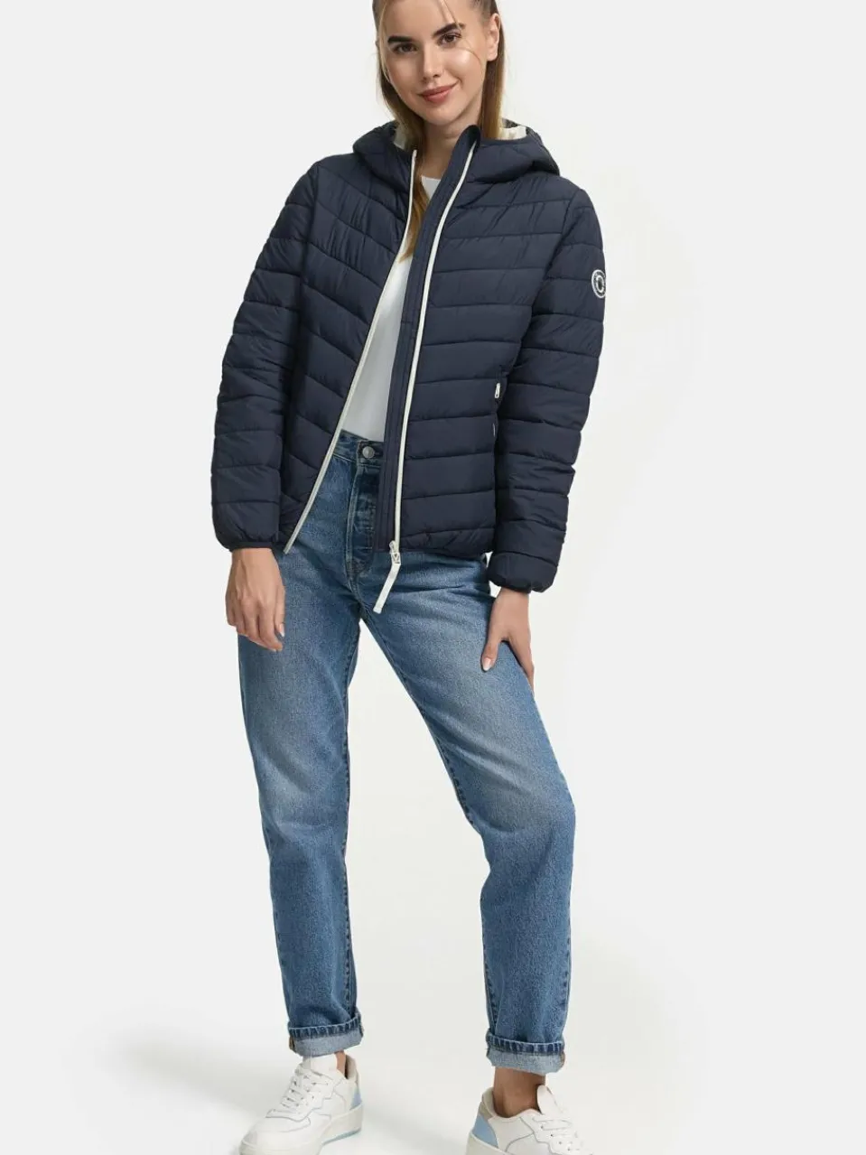 Stilvolle Übergangs-Steppjacke im urbanen, sportlichen Design. Das Highlight: Die Jacke kann in ihre integrierte (innen fest angenähte) Tasche eingepackt und bequem umgehängt werden – perfekt für unterwegs.