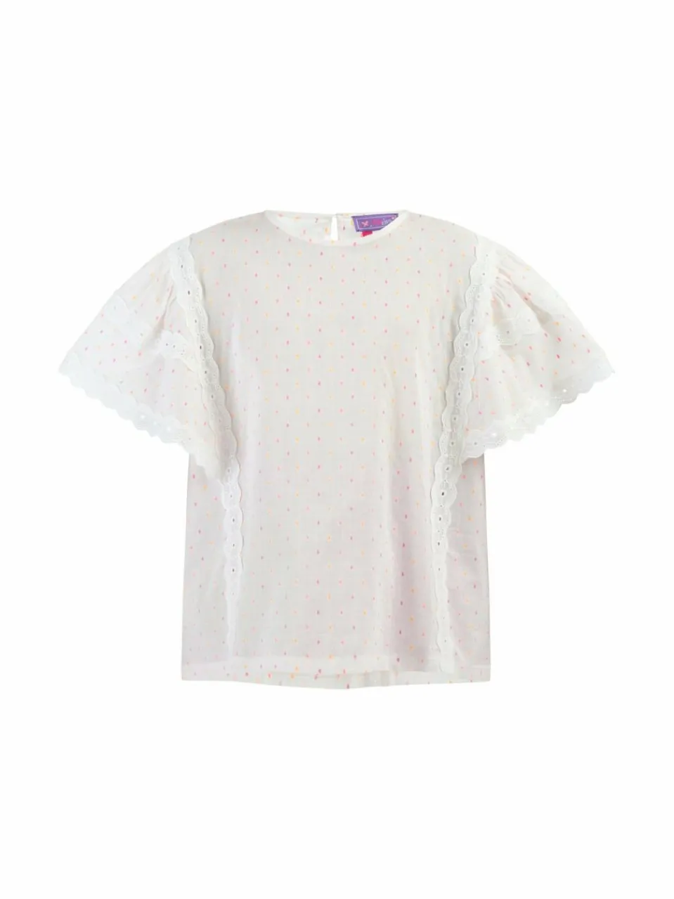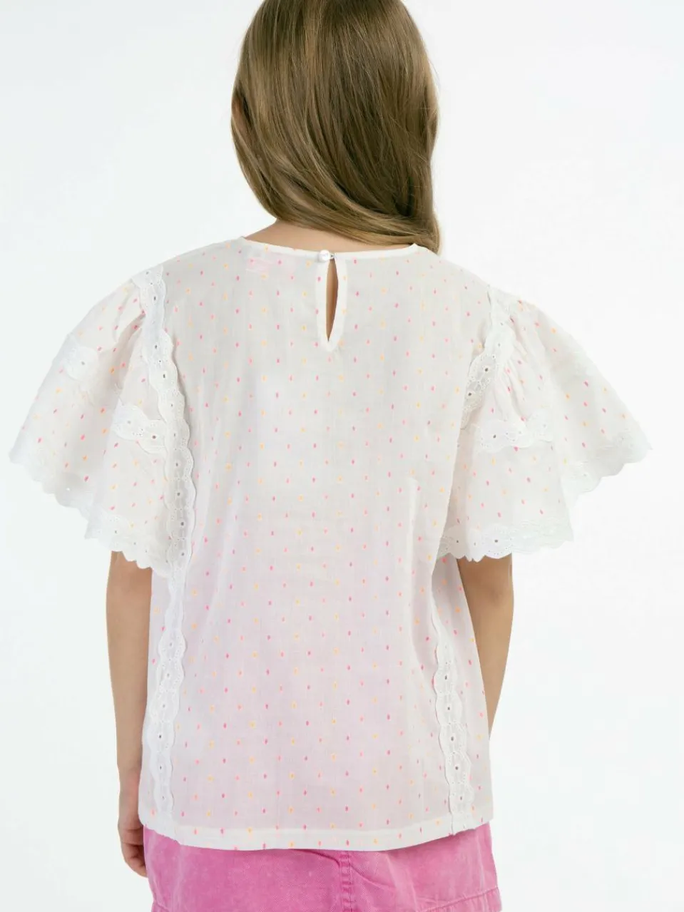 Mit der zauberhaften Mädchenbluse von myMo KIDS werden auch die Kleinen zu jungen Trendsettern. Das legere Modell ist aus einem leichten Baumwollgemisch und mit pastellfarbigen Pünktchen dekoriert. Eine florale Spitze an den weiten Flügelärmeln und am Top sorgt für einen sommerlichen Touch.