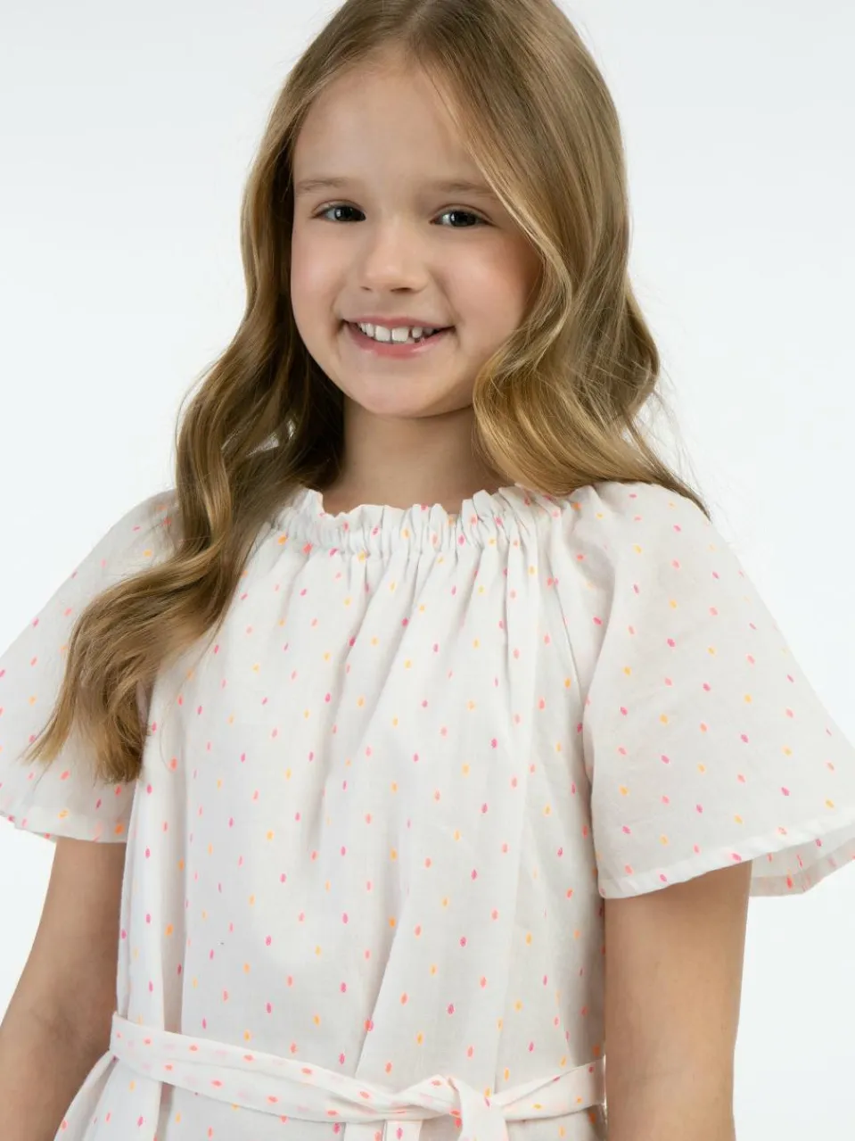 Dieses luftige Sommerkleid von myMo KIDS wird schnell zum Favoriten aller Mädchengarderoben, denn die zarten pastellfarbenen Pünktchen setzten zauberhafte Akzente. Gefertigt aus einem leichten Baumwollgemisch ist es zudem locker geschnitten, hat einen raffinierten gesmokten Ausschnitt, weite Flügelärmel und einen materialgleichen Gürtel. Zwei seitliche Eingrifftaschen runden das hübsche Modell gekonnt ab.