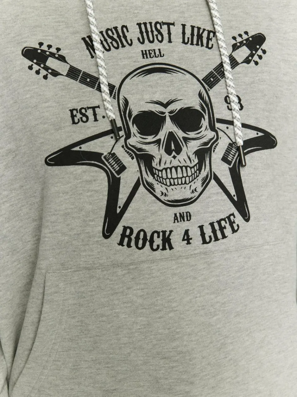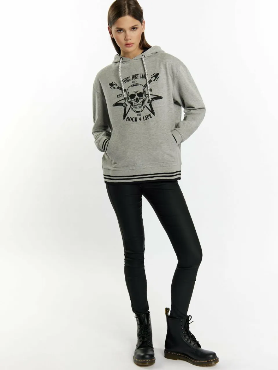 Der rockige Hoodie von myMo ROCKS ist aus einer weichen Baumwoll-Viskose-Mischung in Grau-Melange gefertigt, hat eine Kapuze mit zweifarbiger Kordel und eine coole Attitude. Die kontrastfarbenen Streifen an den Bündchen sowie der Skull-Print lassen den Sweater zum trendigen Statement-Piece avancieren.