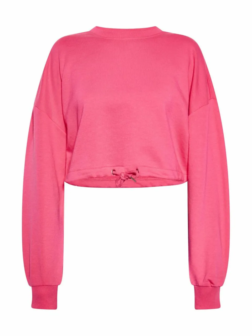 Introducing a sporty sweatshirt with a cropped silhouette, long sleeves and ribbed texture at the round neckline and cuffs. This short terry sweatshirt features round neckline and an adjustable string, offering a relaxed, customizable fit. Ideal for those seeking a stylish and comfortable addition to their wardrobe.