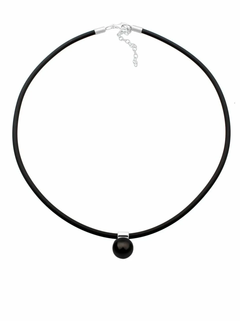 Modisches Damen Kautschuk-Halskette mit einem Synthetische Perle-Anhänger aus 925er Sterling Silber. Die trendige Kautschukkette in schwarz mit Karabinerverschluss kombiniert einem schlichten synthetischen Perlen Anhänger verleiht deinem Outfit ein Hauch von Klasse. Ergänze deinen Schmuck um dieses modische Highlight!