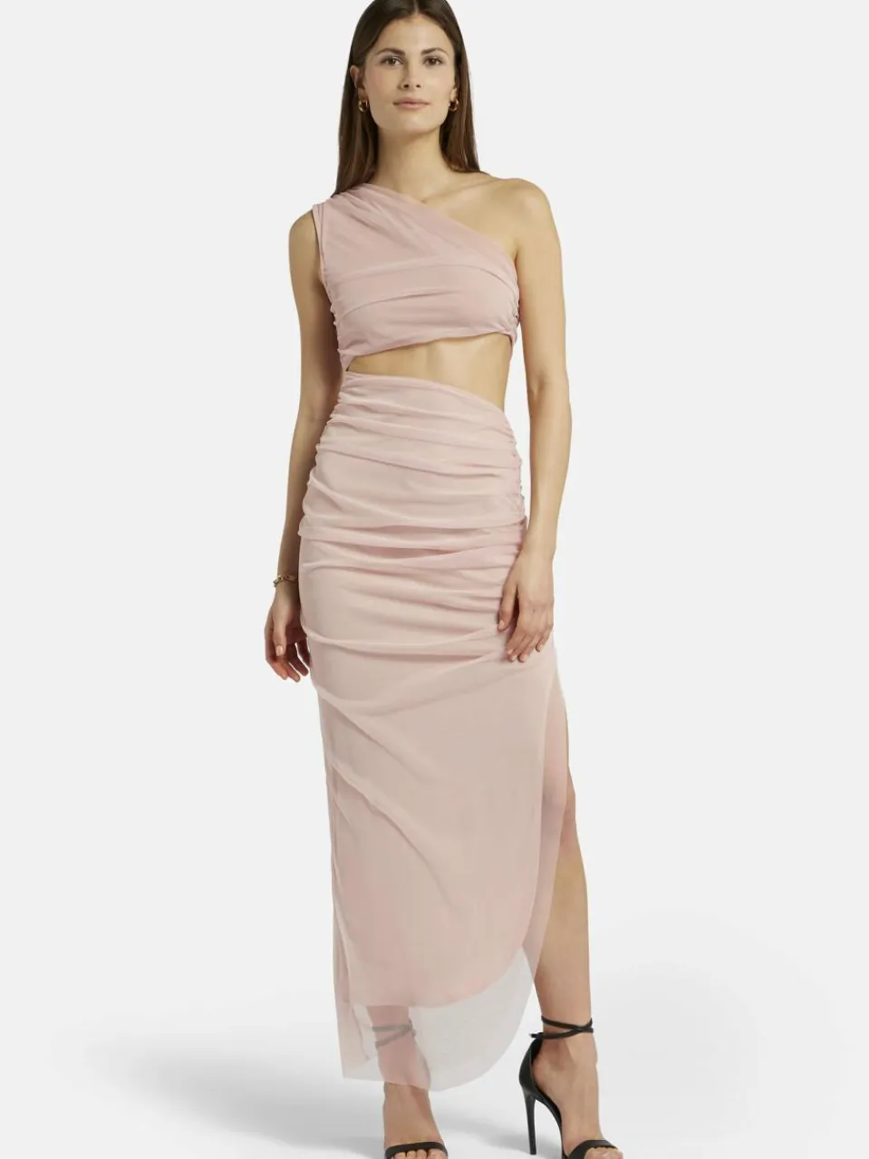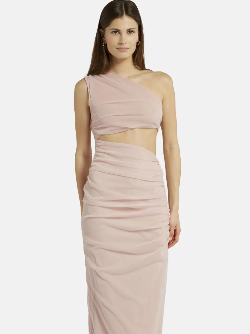 Das Kleid AWITO MAXI im One-Shoulder-Design aus Mesh präsentiert sich in einer gerafften Silhouette, die elegant über die Figur fällt. Der innenliegende Jersey schmiegt sich nahtlos an Ihre Haut an. Das Design wird durch einen asymmetrischen Saum abgerundet und setzt mit dem Cut-Out an der Taille einen spannenden Akzent. Made in Italy.