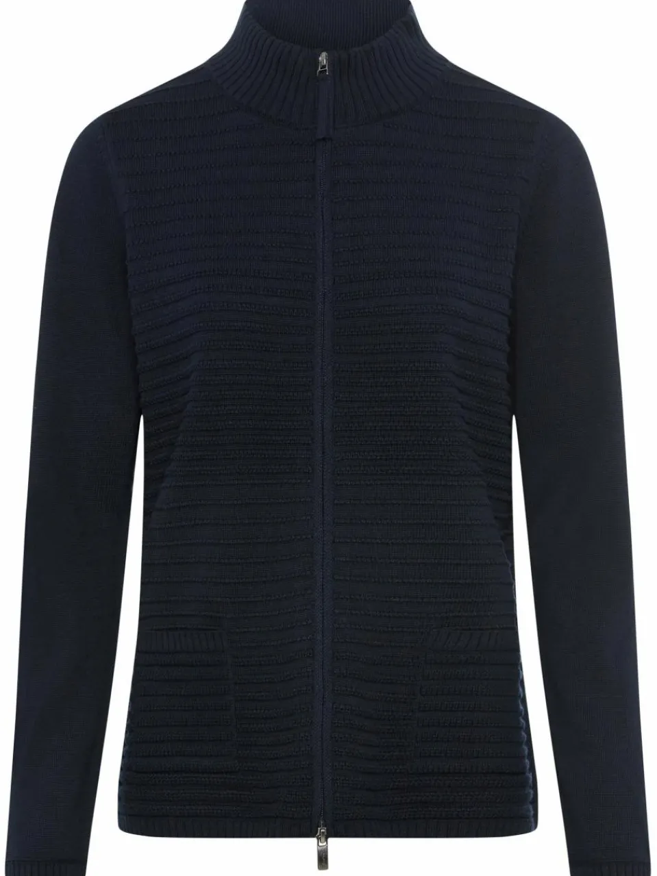 Dieser stylishe Cardigan vereint modernen Stil mit höchstem Komfort. Die Vorderseite besticht durch eine elegante Streifen-Optik, während die Rückseite und die Ärmel glatt gestrickt sind, was einen schönen Kontrast ergibt. Der Stehkragen und die langen Ärmel machen ihn zu einem idealen Begleiter für kühlere Tage. Die eng anliegende, taillierte Form betont die Silhouette und sorgt für eine schmeichelhafte Passform.