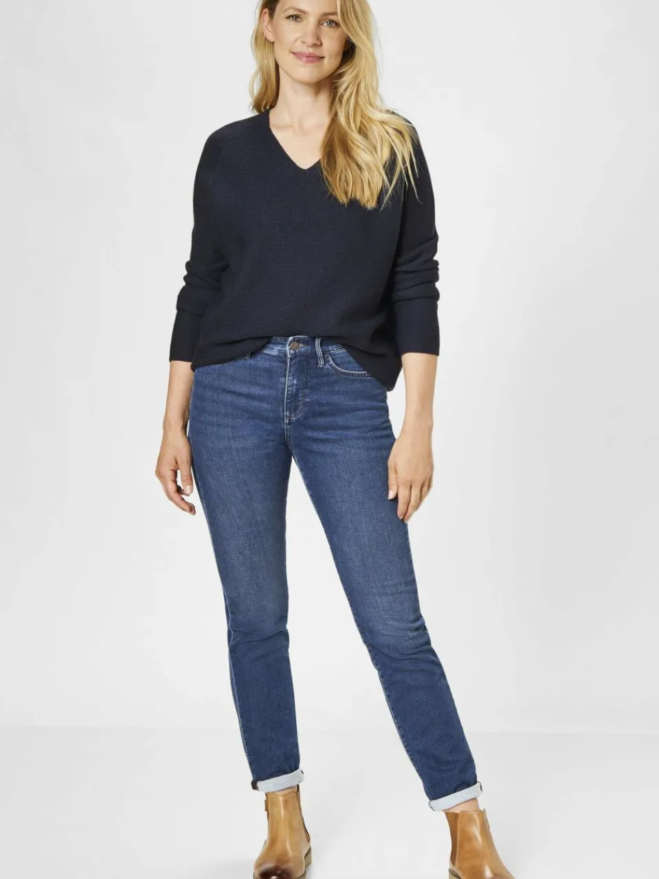 - Hohe Bundhöhe und schmaler Beinverlauf